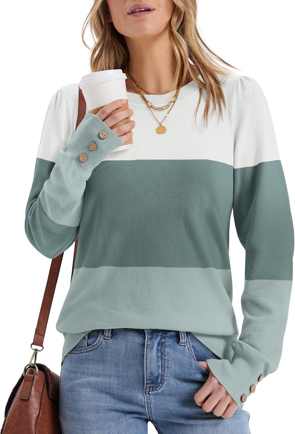 Womens Sweaters Fall Fashion 2025 Long Sleeve Button Cuff Soft Knit Pullover Trendy Tops Dressy Casual Blouses(White Green Blue)
