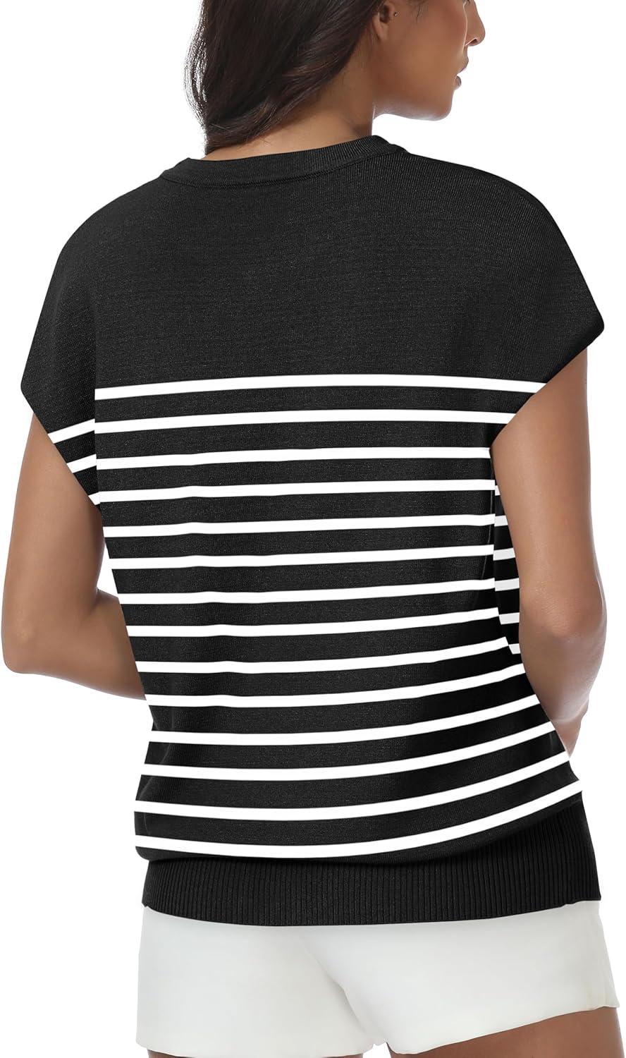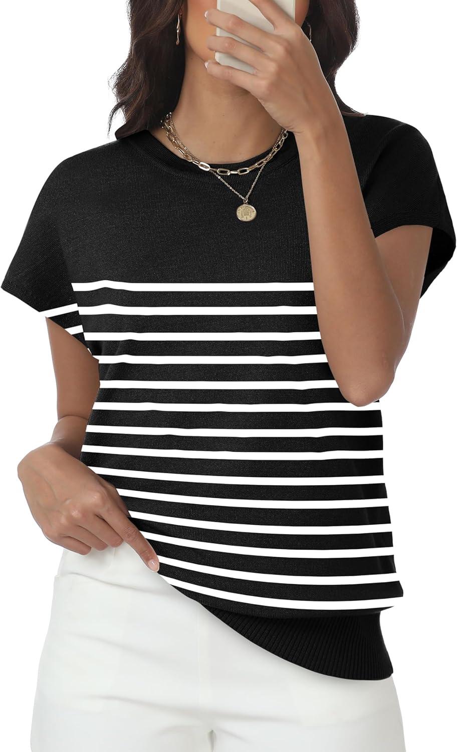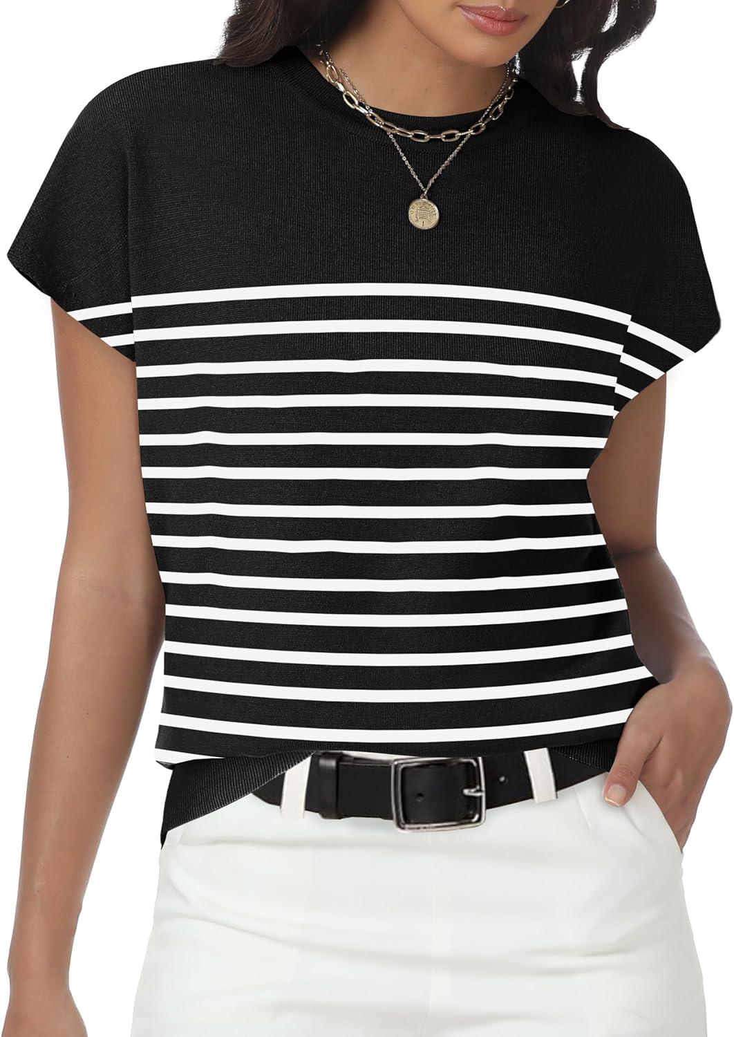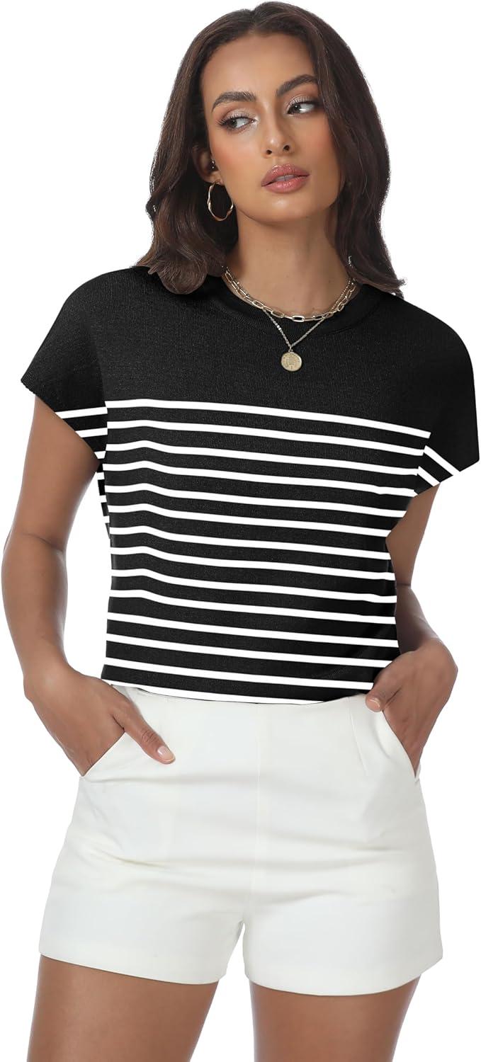 Womens Tops Summer Sweater Short Sleeve Shirts Dressy Casual Basic Casual Cap Sleeve Tops Beach Vacation Clothes(Black White)