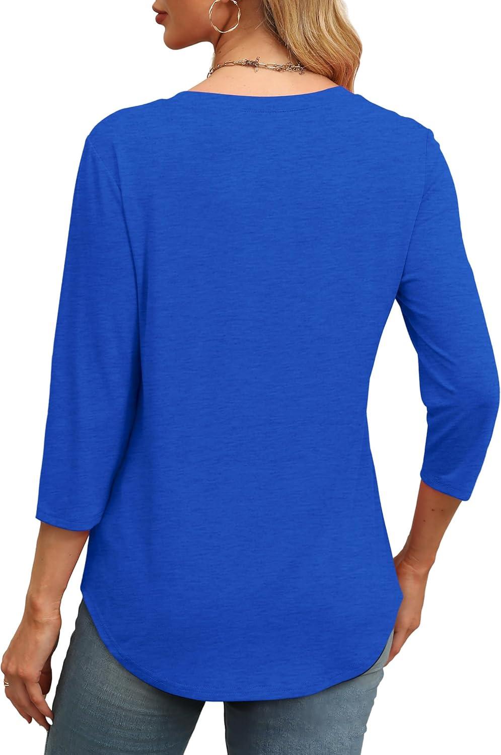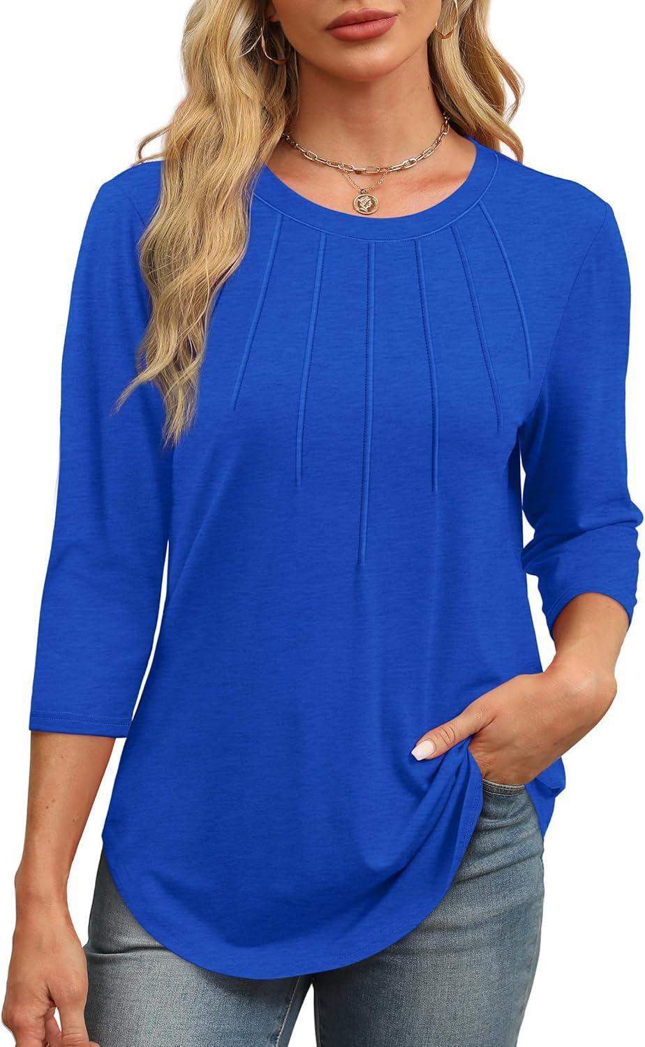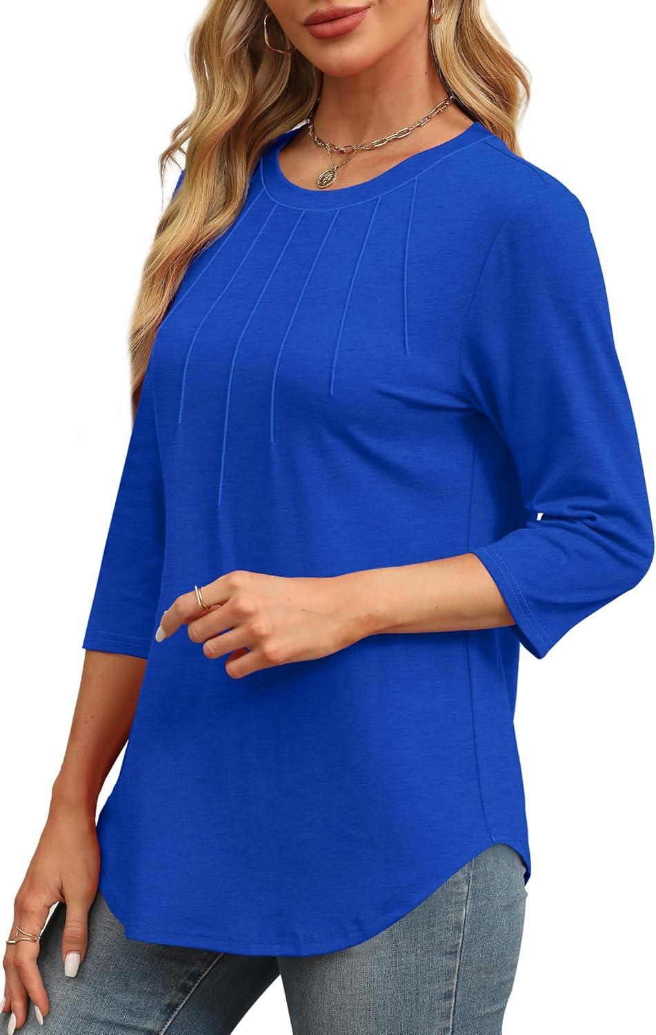 XIEERDUO 3/4 Length Sleeve Womens Tops Round Neck Casual Tunic Tops Basic Pleated Shirts Loose Fit 2025(Blue)