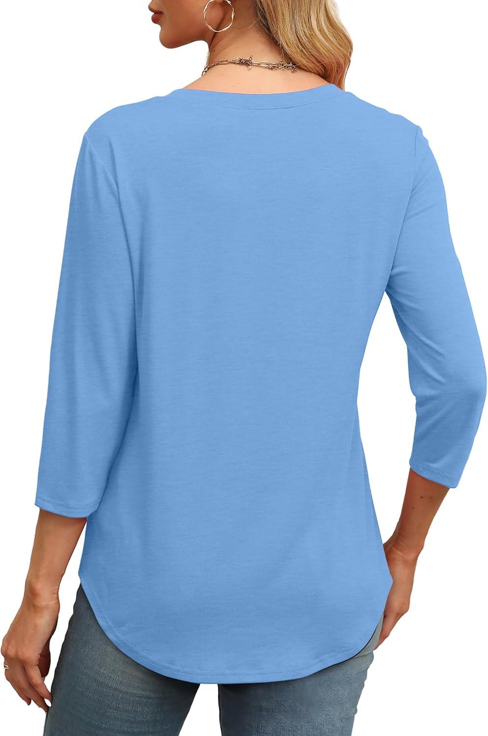 XIEERDUO 3/4 Length Sleeve Womens Tops Round Neck Casual Tunic Tops Basic Pleated Shirts Loose Fit 2025(Light Blue)