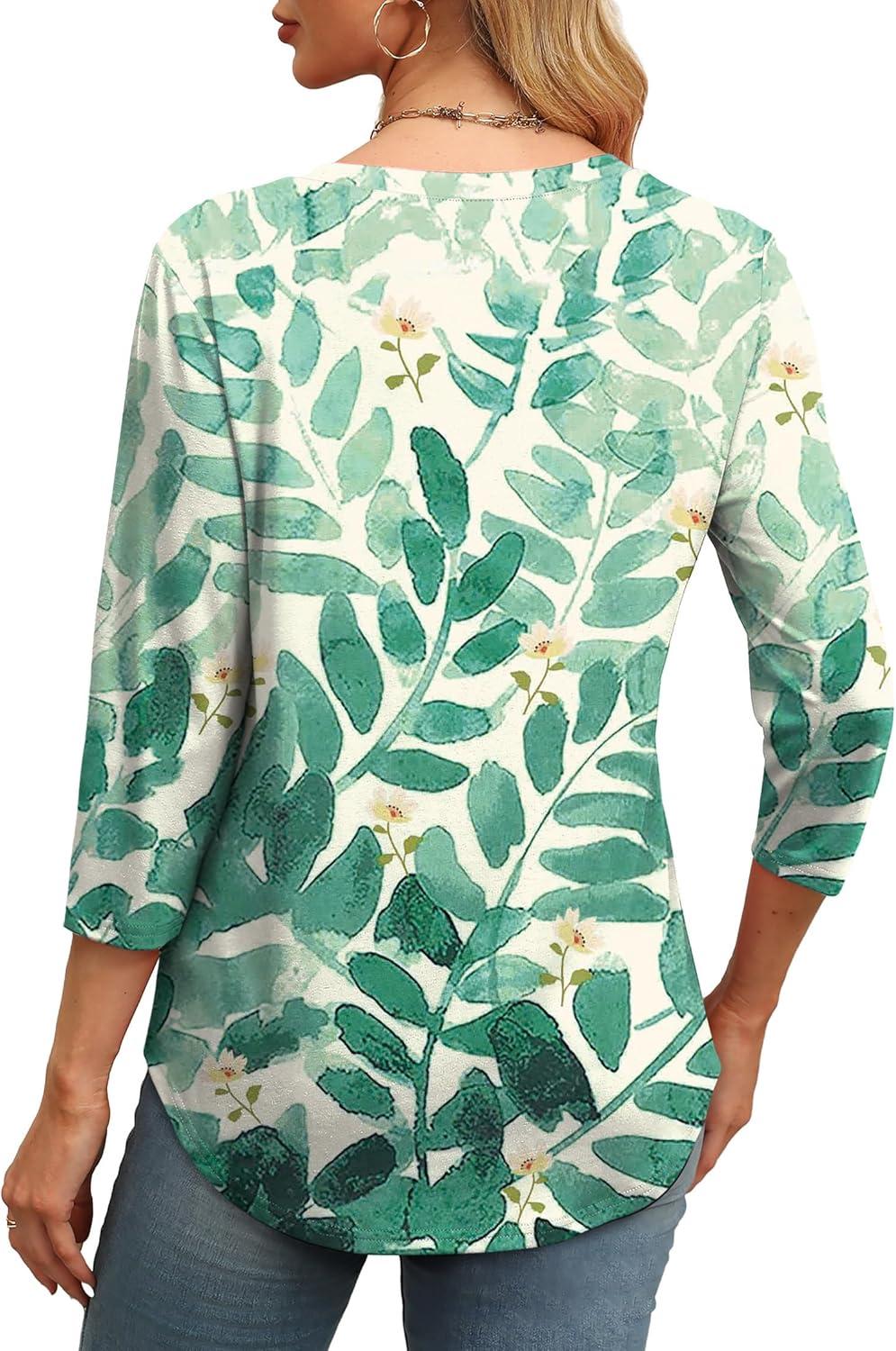 XIEERDUO 3/4 Length Sleeve Womens Tops Round Neck Casual Tunic Tops Basic Pleated Shirts Loose Fit 2025(Patterned-blue Leaf)