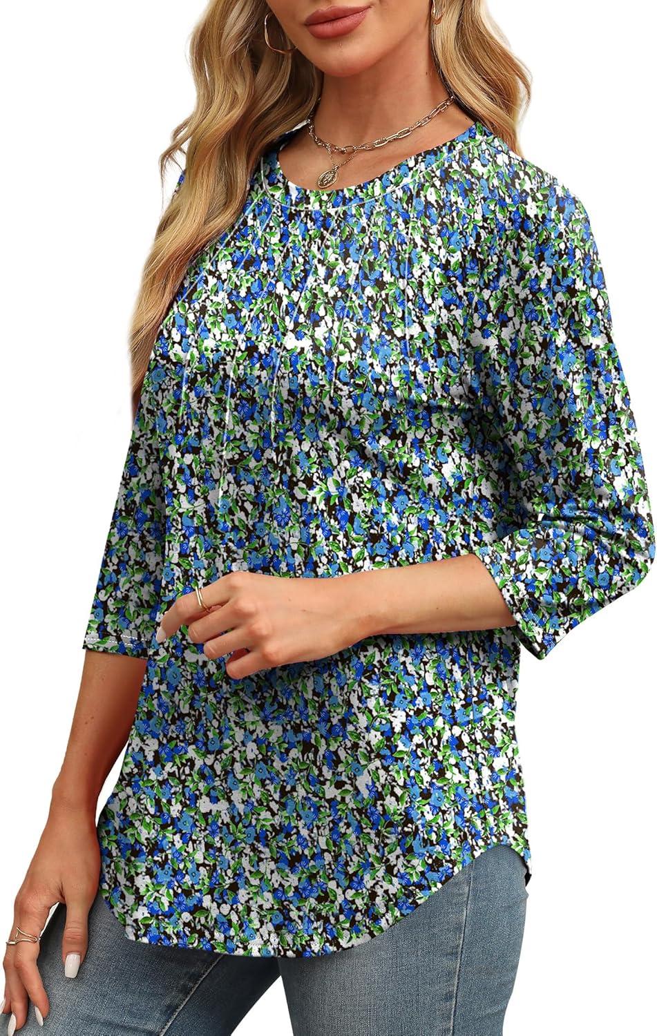 XIEERDUO 3/4 Length Sleeve Womens Tops Round Neck Casual Tunic Tops Basic Pleated Shirts Loose Fit 2025(Patterned-floral Blue)