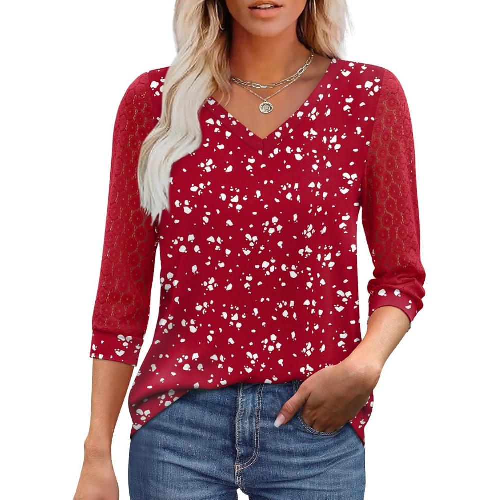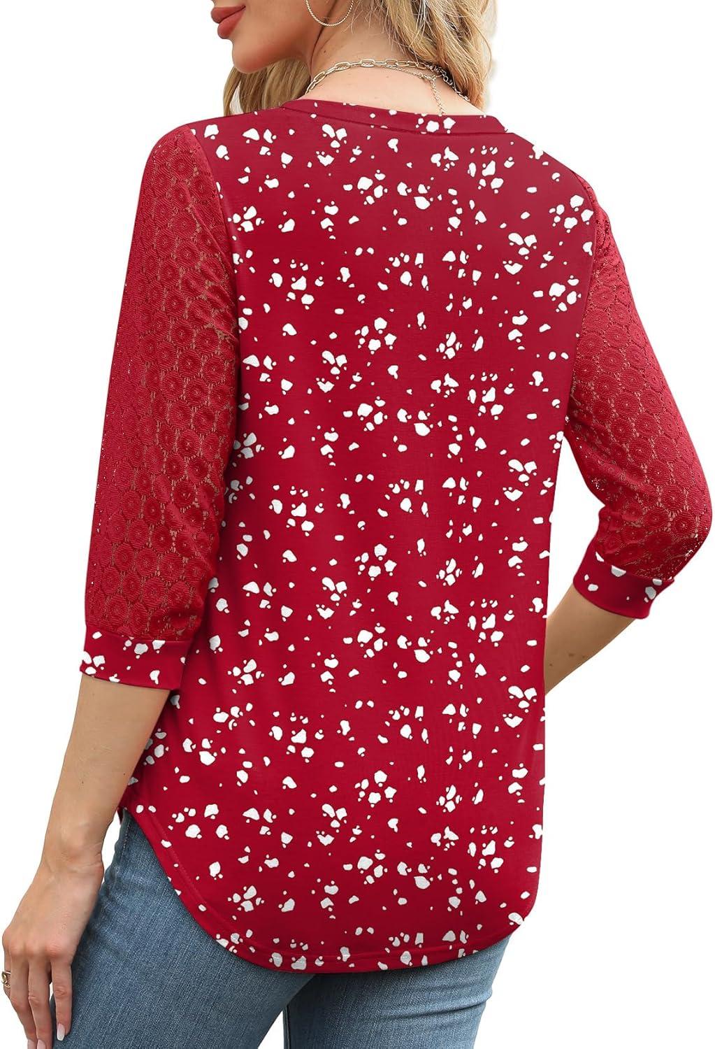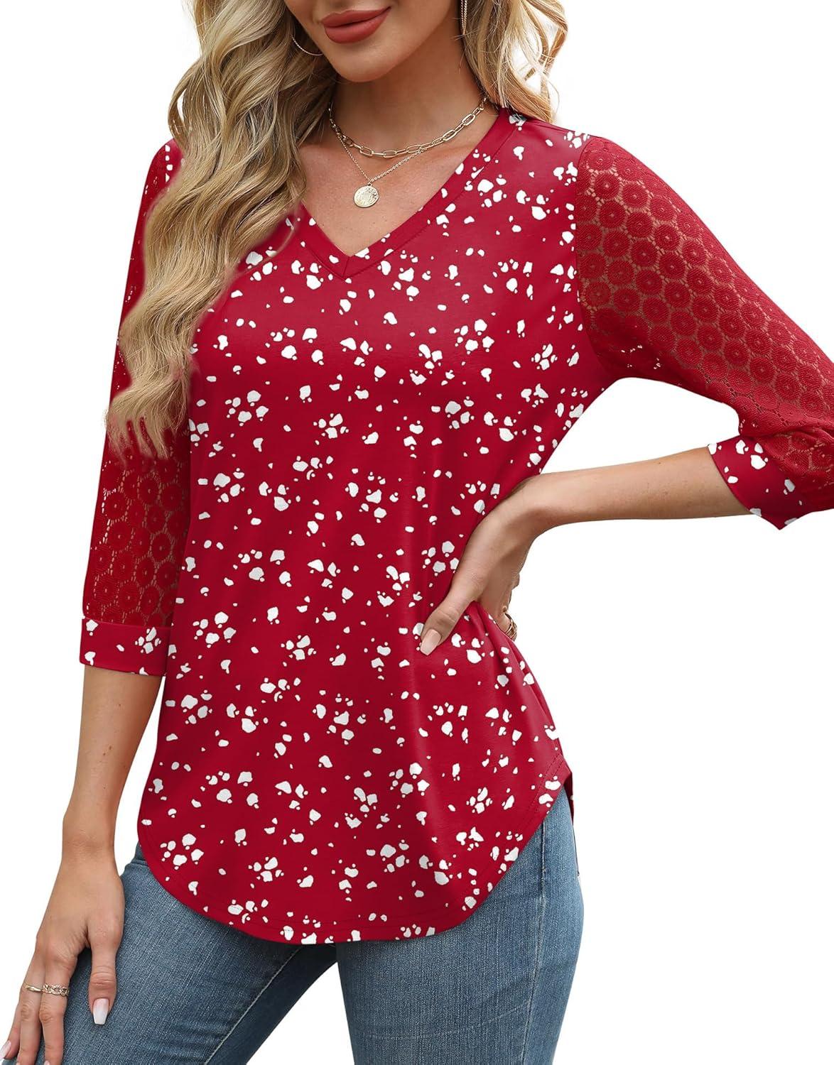 XIEERDUO 3/4 Length Sleeve Womens Tops V-Neck Lace Tunic Tops Business Casual Blouses 2025(Patterned-red Print)