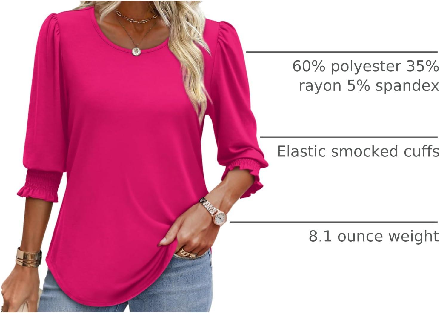 XIEERDUO Blouses for Women Dressy Casual 3/4 Length Sleeve Womens Tops with Smocked Cuffs(E-hot Pink)