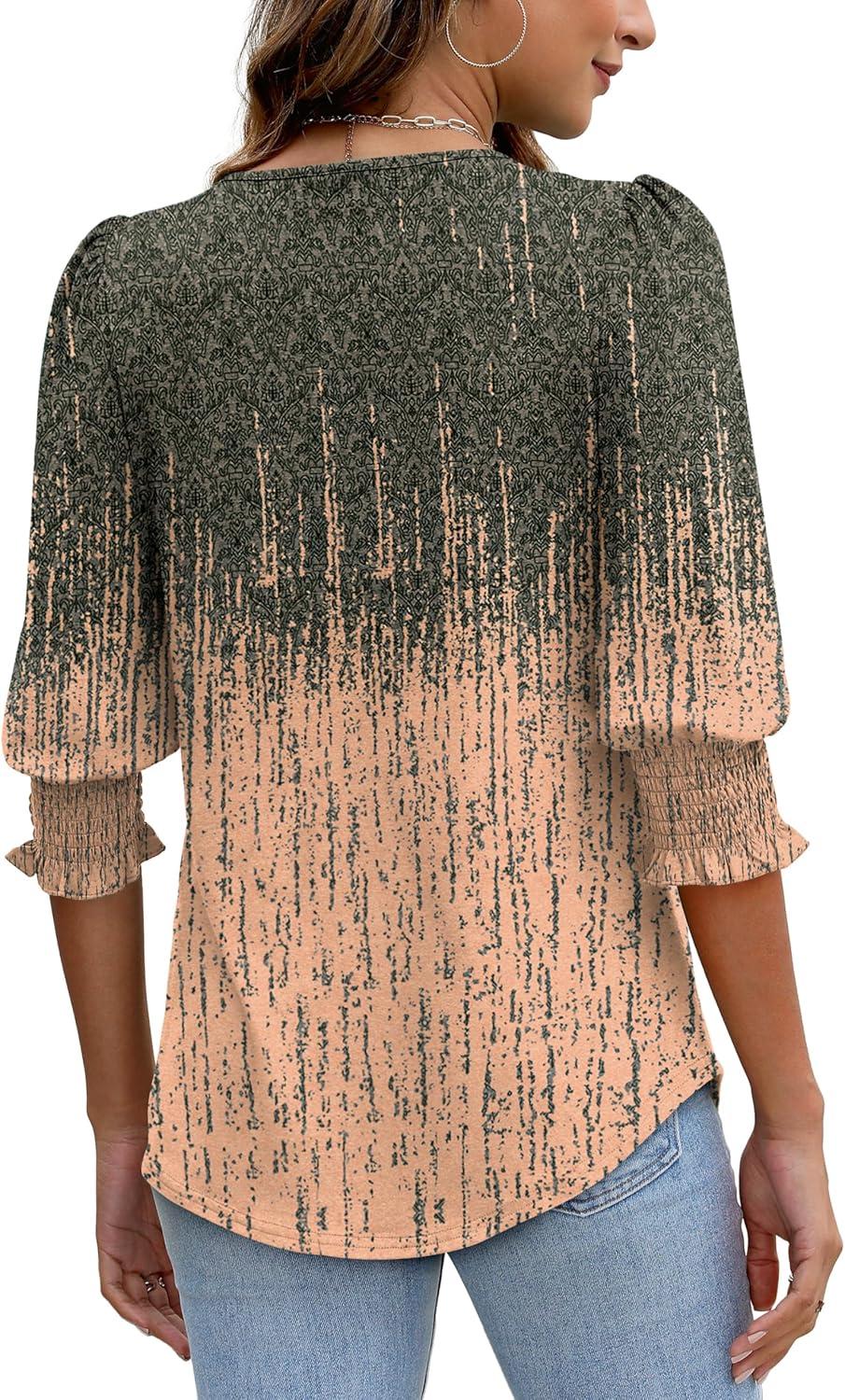 XIEERDUO Blouses for Women Dressy Casual 3/4 Length Sleeve Womens Tops with Smocked Cuffs(G-grey Pink)