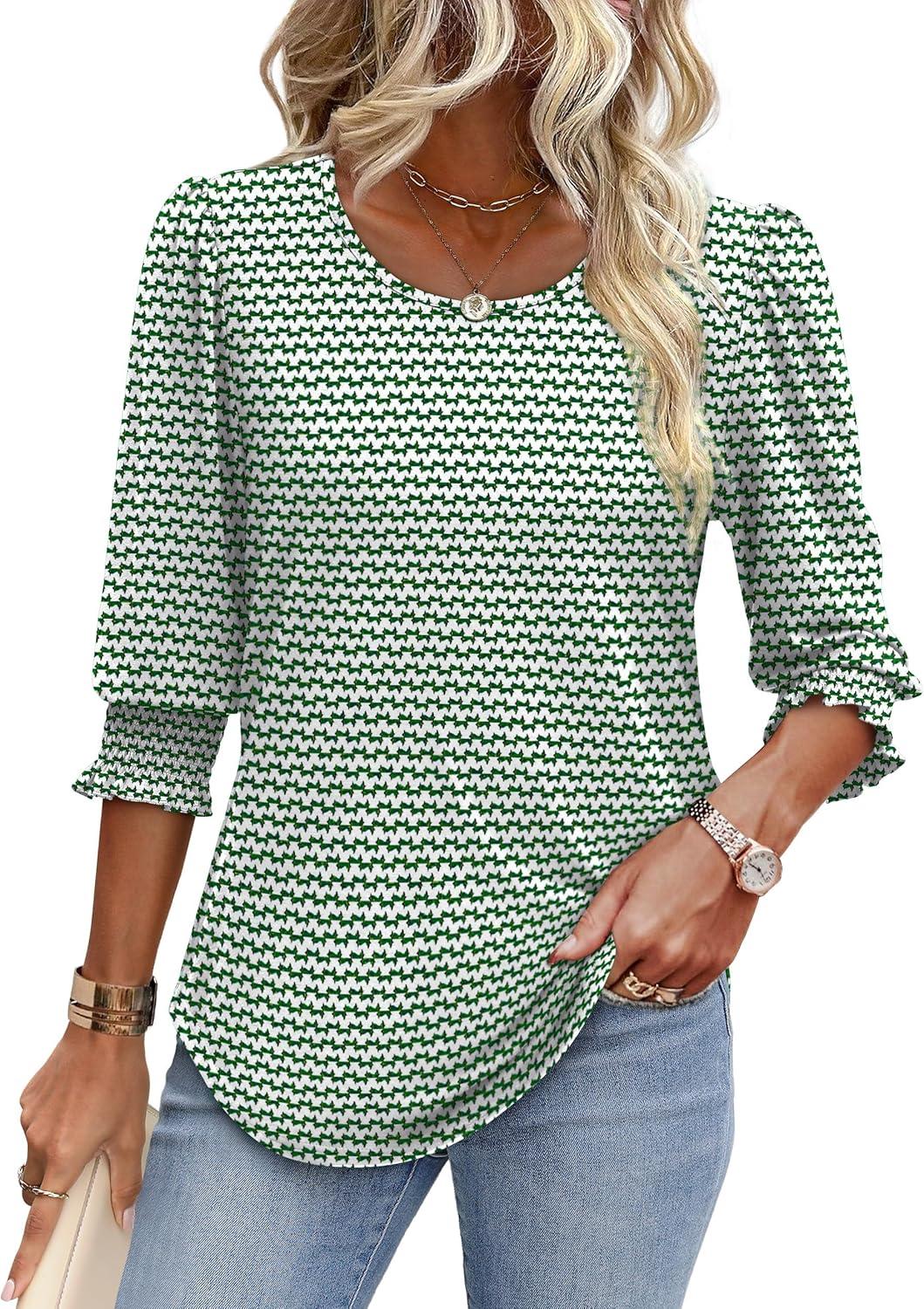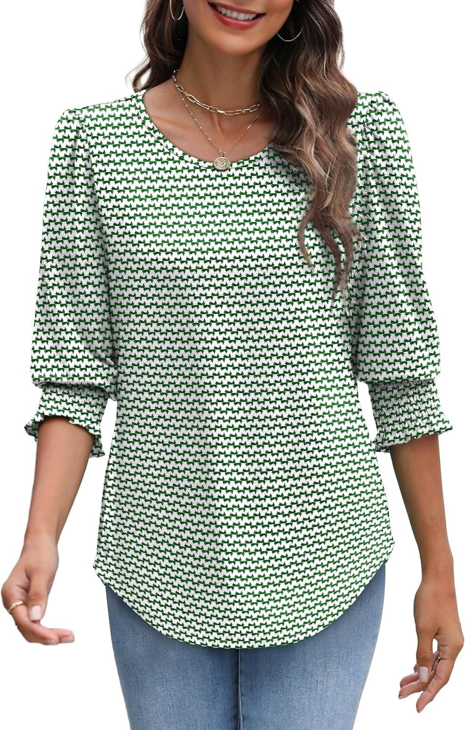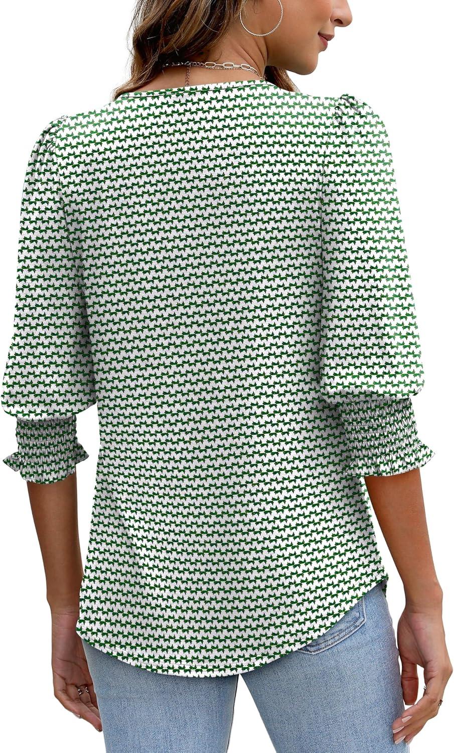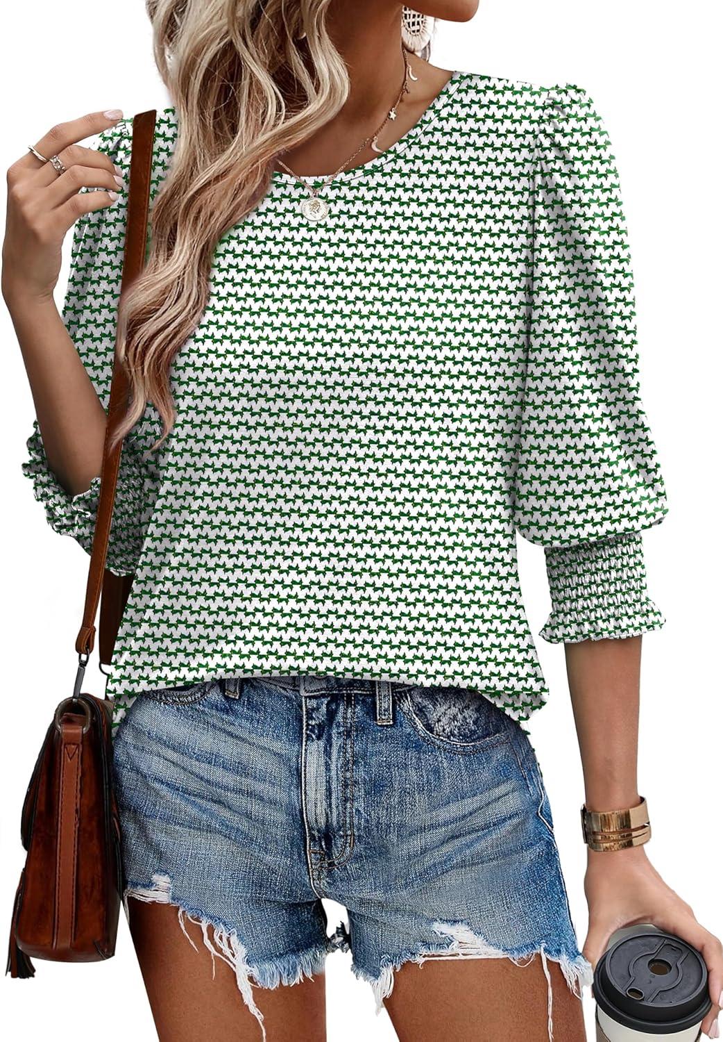 XIEERDUO Blouses for Women Dressy Casual 3/4 Length Sleeve Womens Tops with Smocked Cuffs(J-z-greenstripe)
