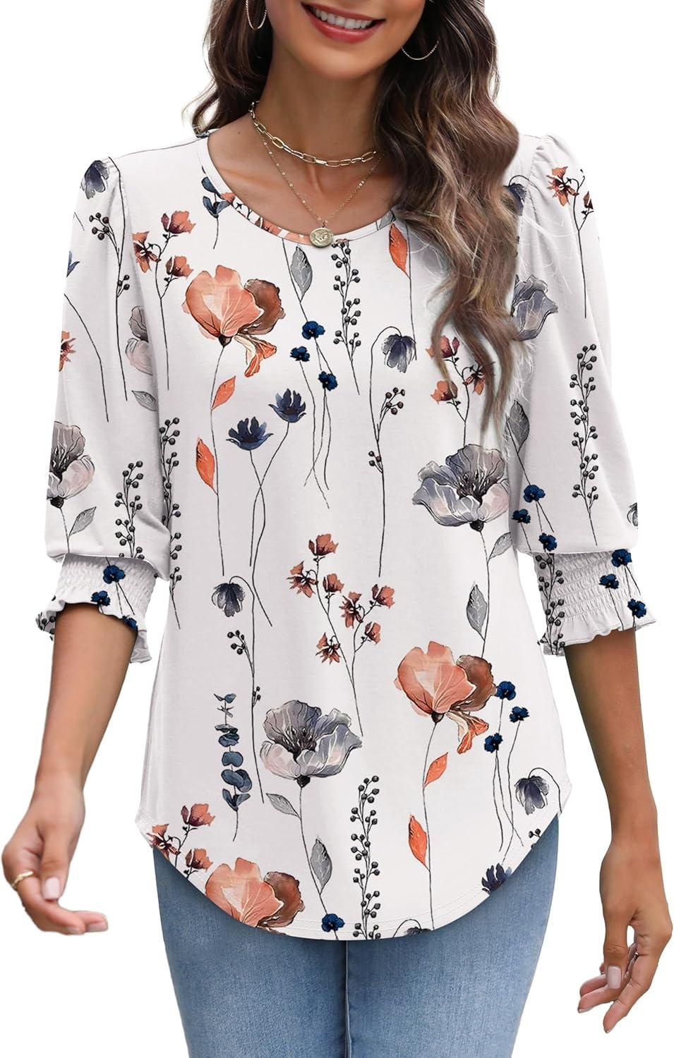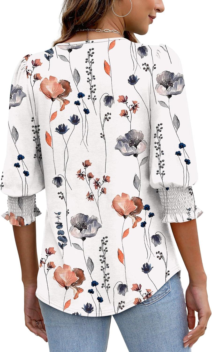 XIEERDUO Blouses for Women Dressy Casual 3/4 Length Sleeve Womens Tops with Smocked Cuffs(Q-white Floral)