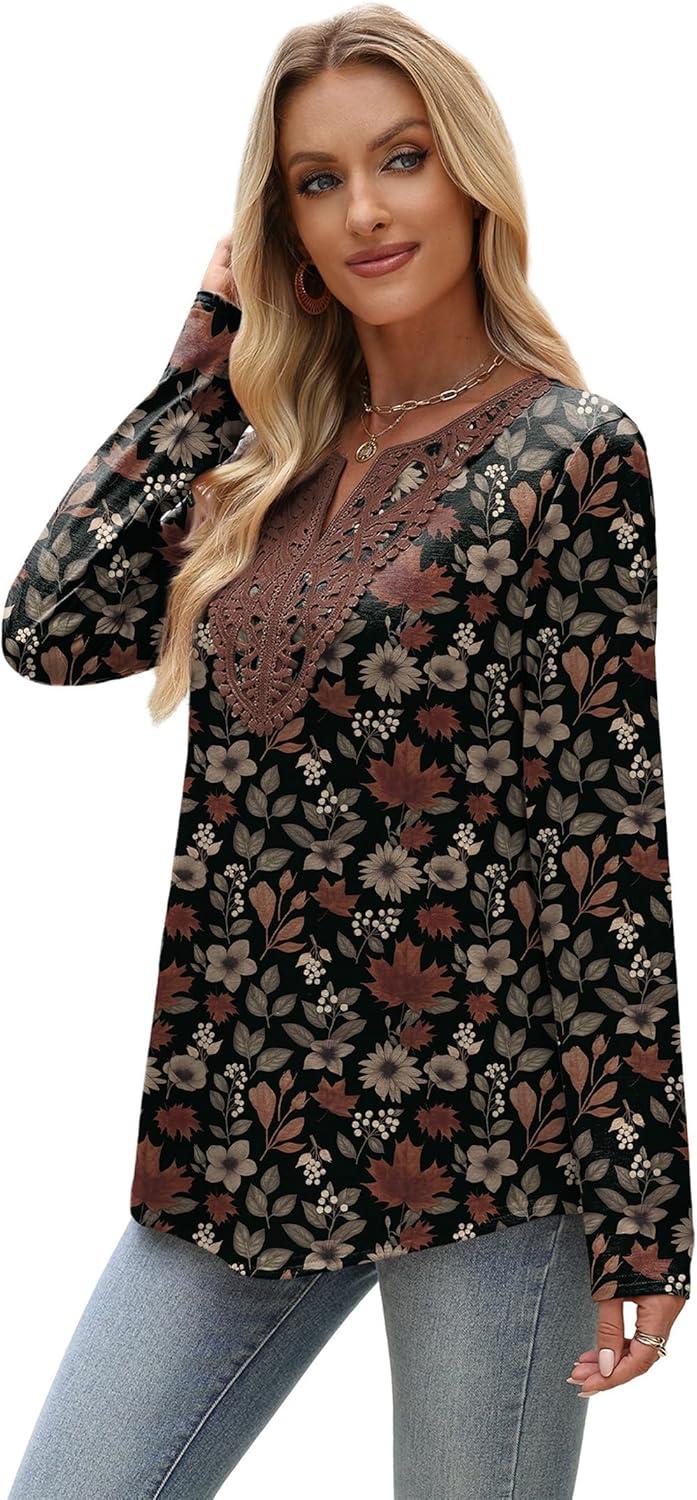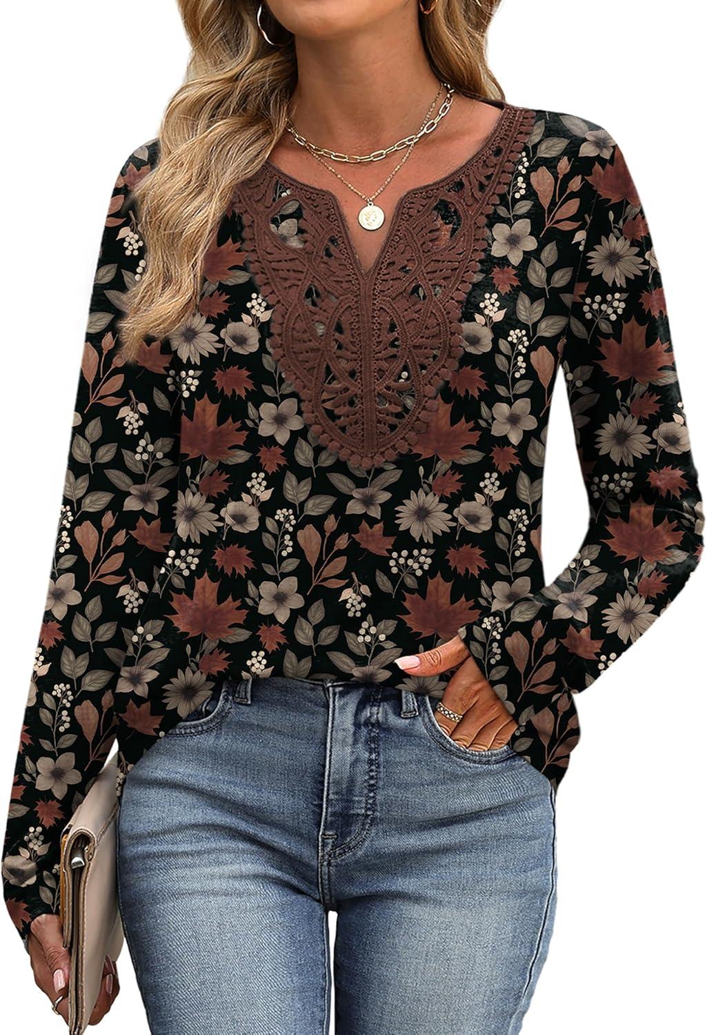 XIEERDUO Boho Tops for Women Blouses Dressy Casual V Neck Long Sleeve Shirts Fall Outfits Trendy Vacation Clothes(Z Grey Printed)