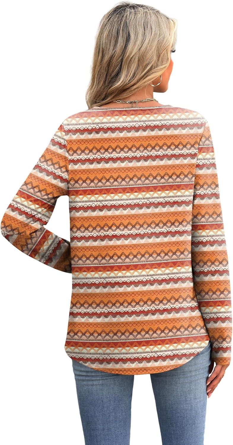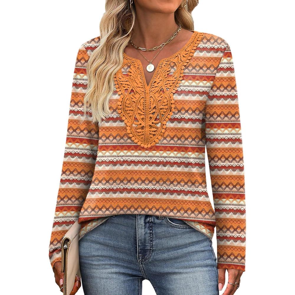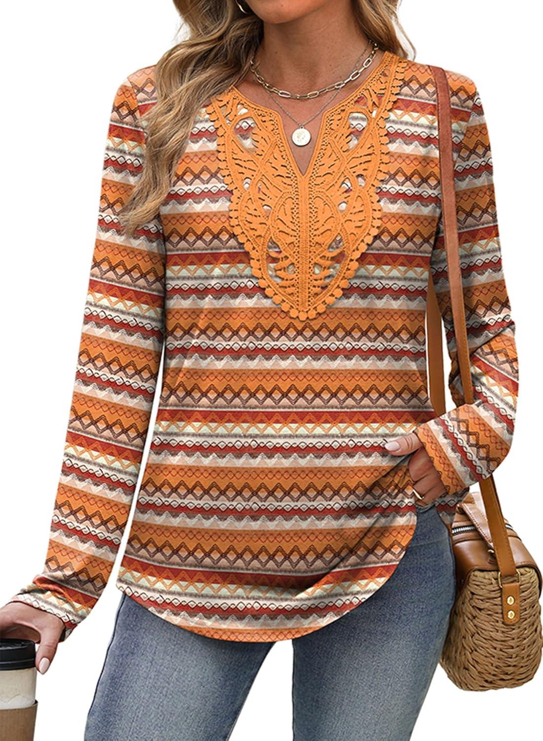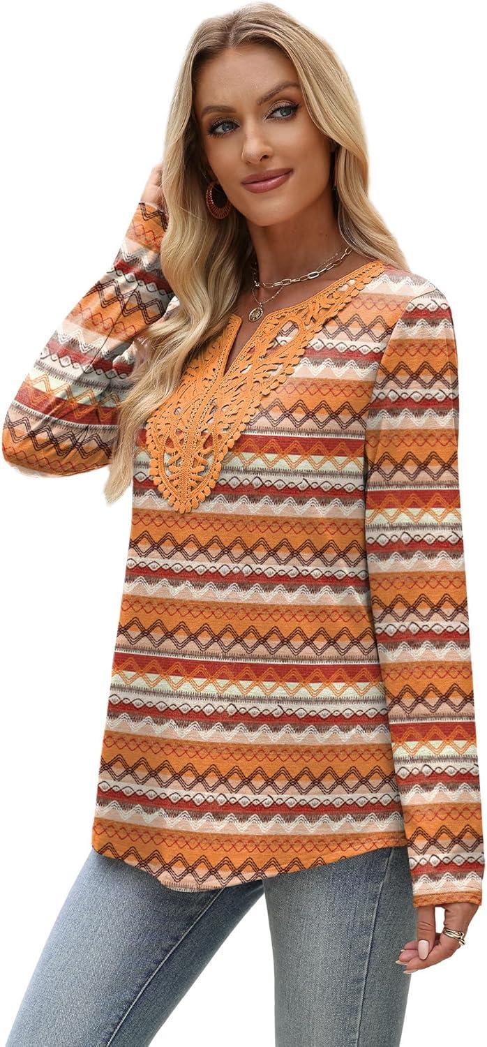 XIEERDUO Boho Tops for Women Blouses Dressy Casual V Neck Long Sleeve Shirts Fall Outfits Trendy Vacation Clothes(Z Orange Printed)