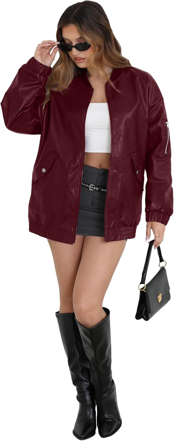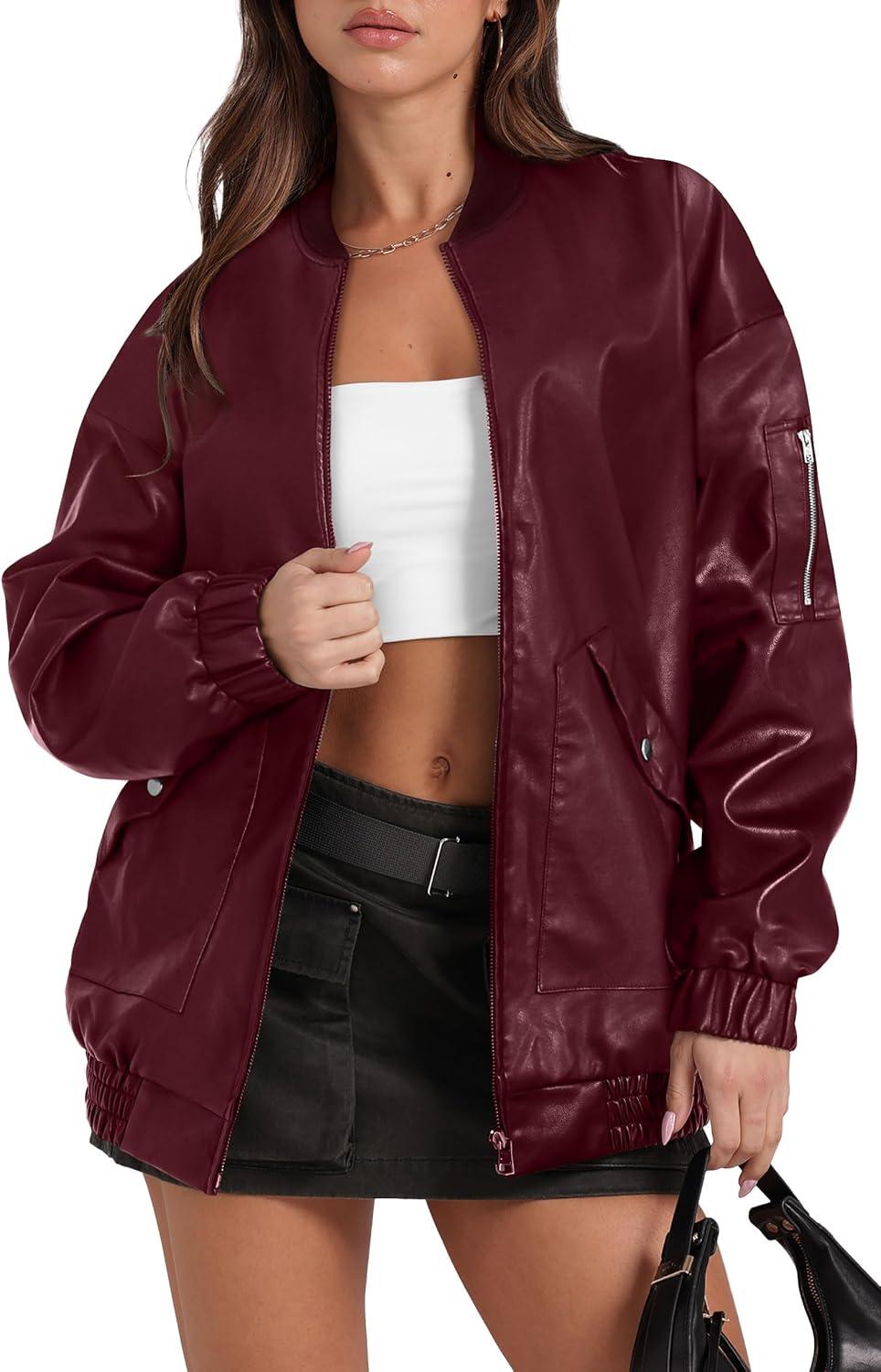 XIEERDUO Faux Leather Jacket Women Oversized Motorcycle Bomber Coats Zip Up Sleeve Pocket 2025 Fall Winter Clothes(Red)