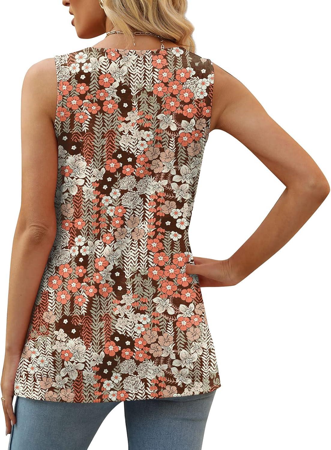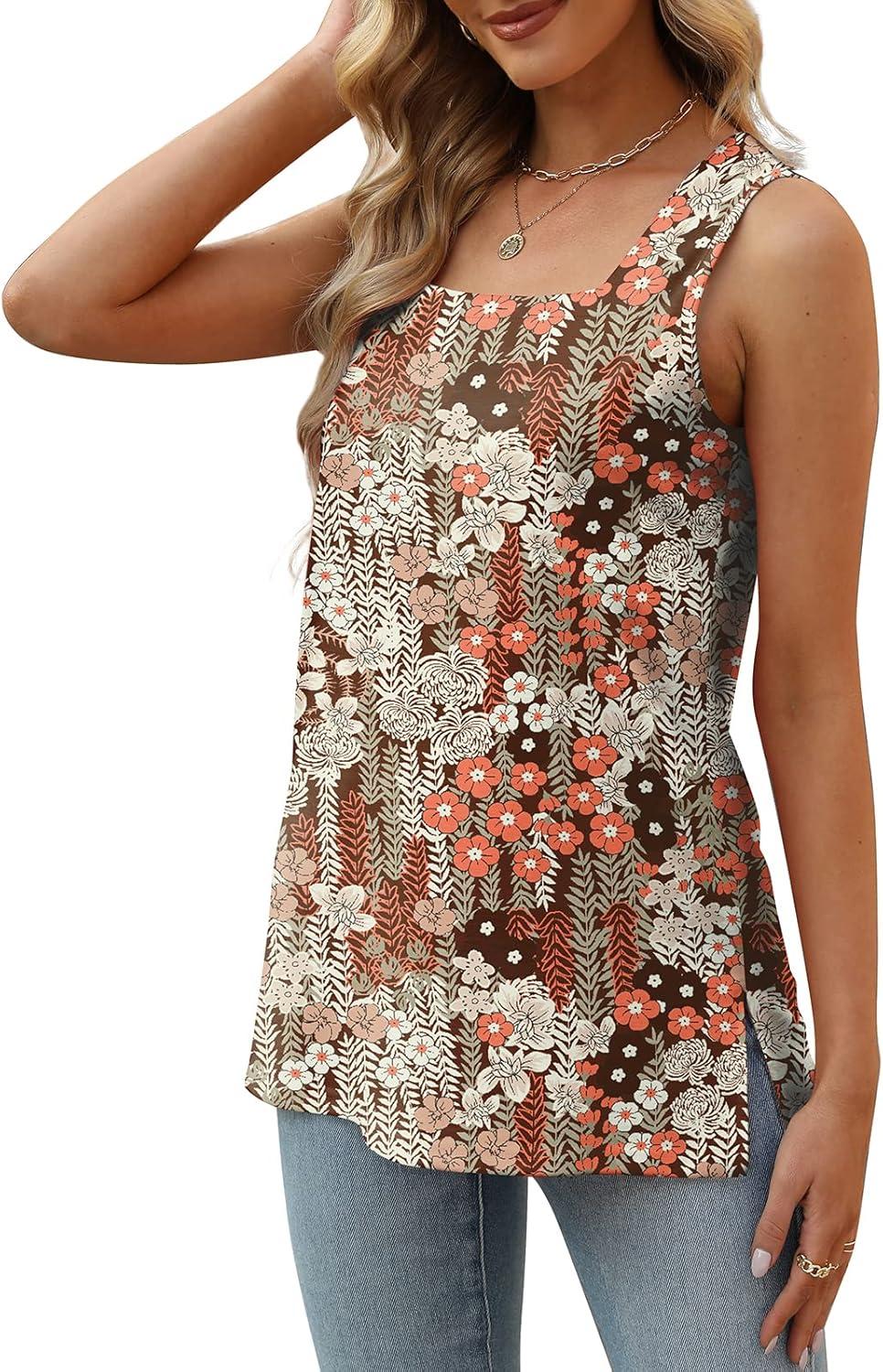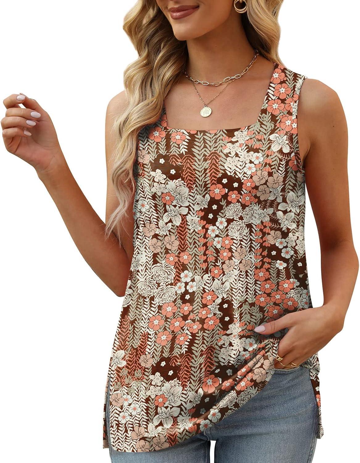 XIEERDUO Summer Tank Tops for Women Square Neck Loose Fit Casual Fashion Flowy Sleeveless(03-floral Brown)