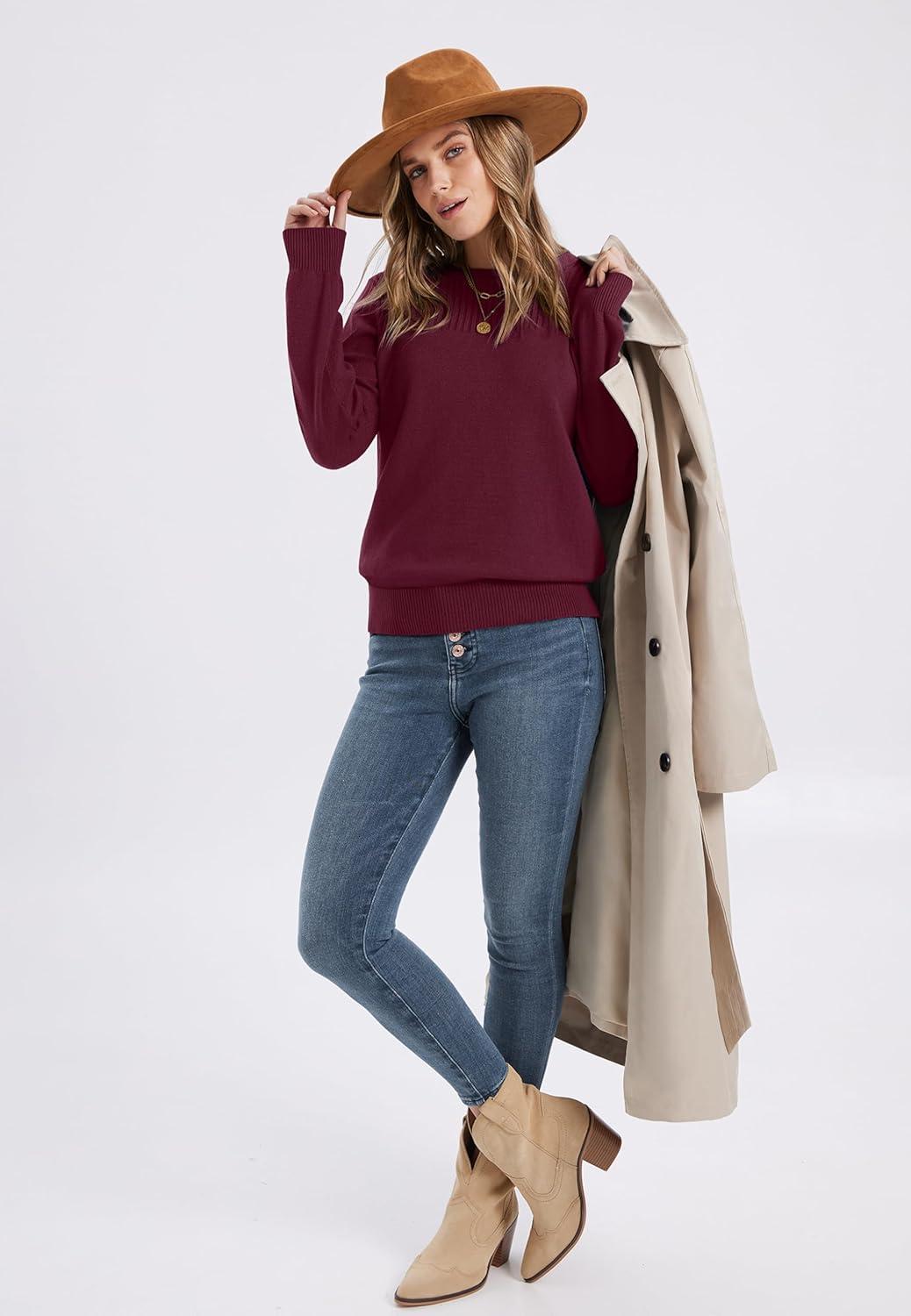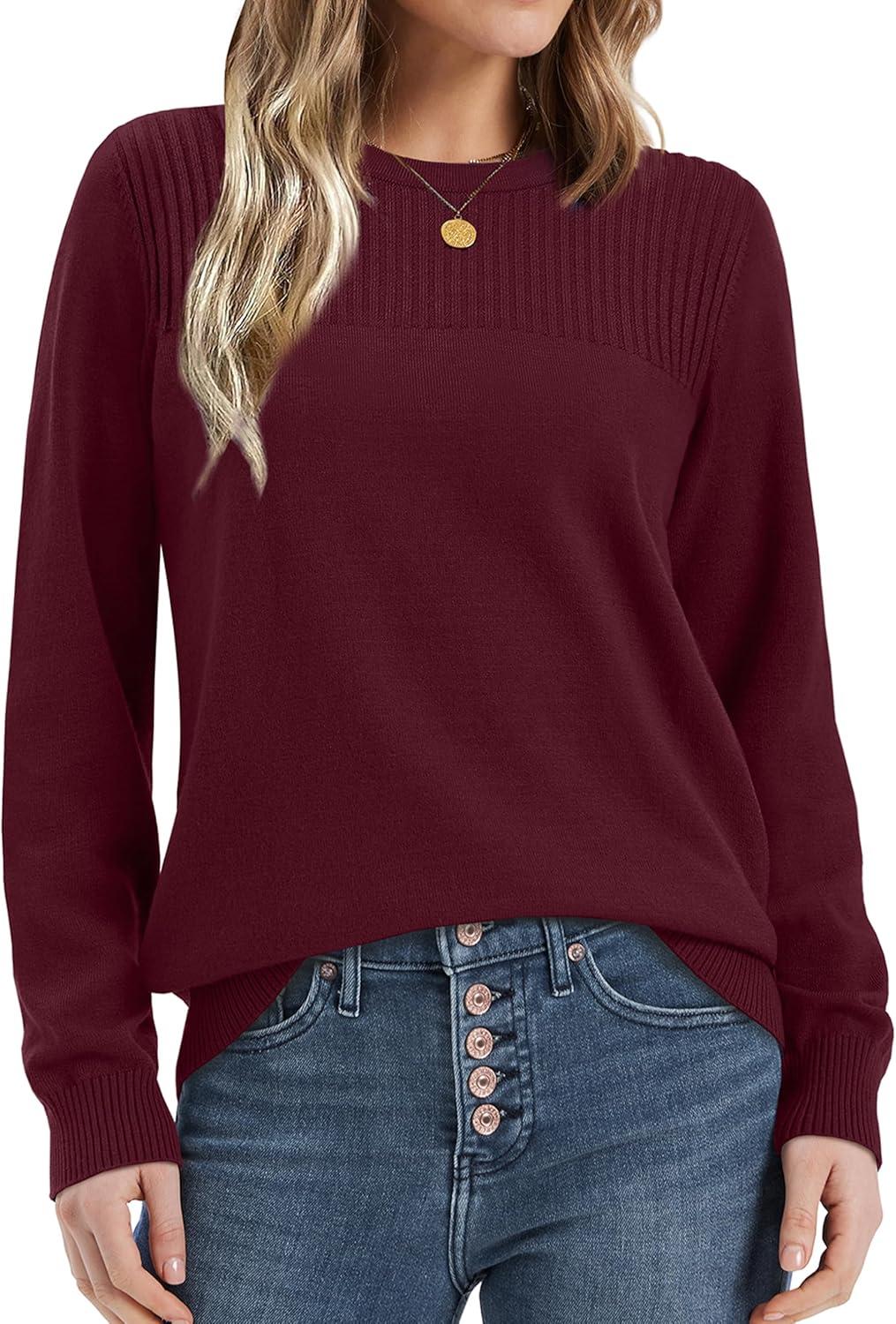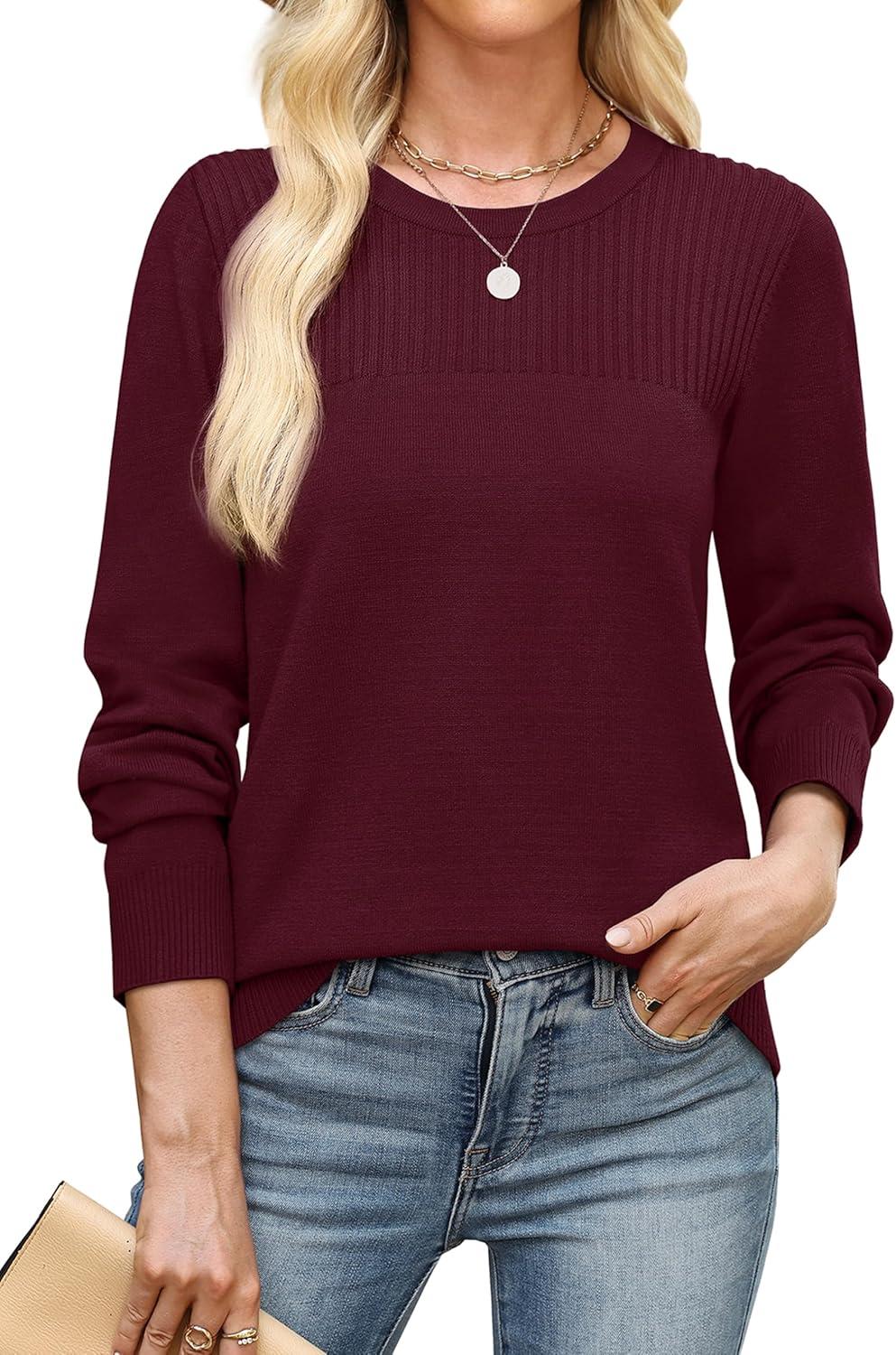 XIEERDUO Sweaters for Women Long Sleeve Shirts Round Neck Ribbed Knit Pullover Sweater Fashion Clothing(Burgundy)