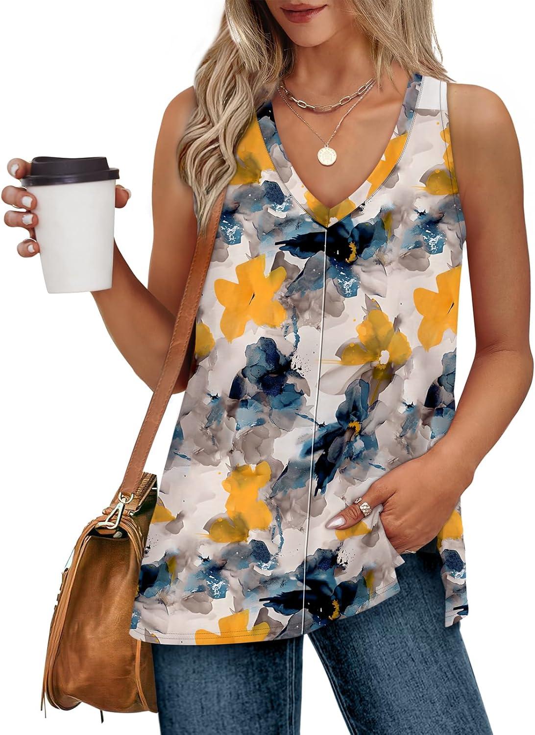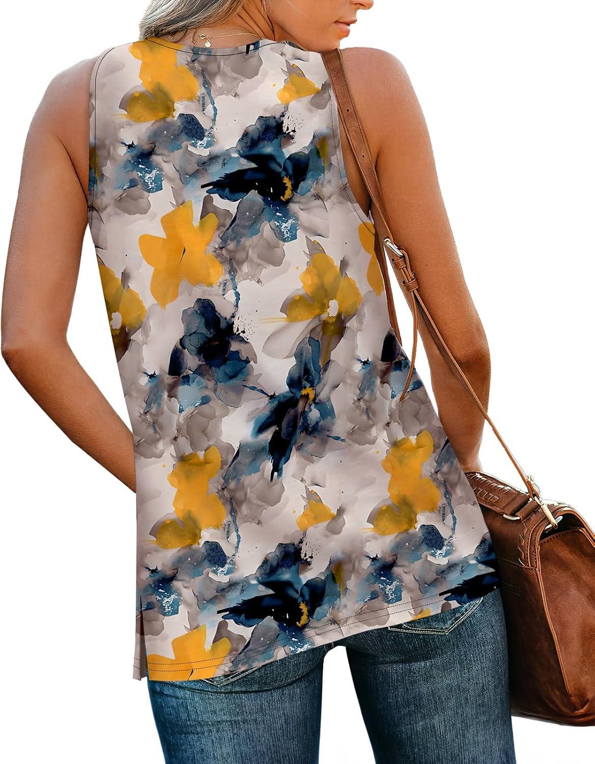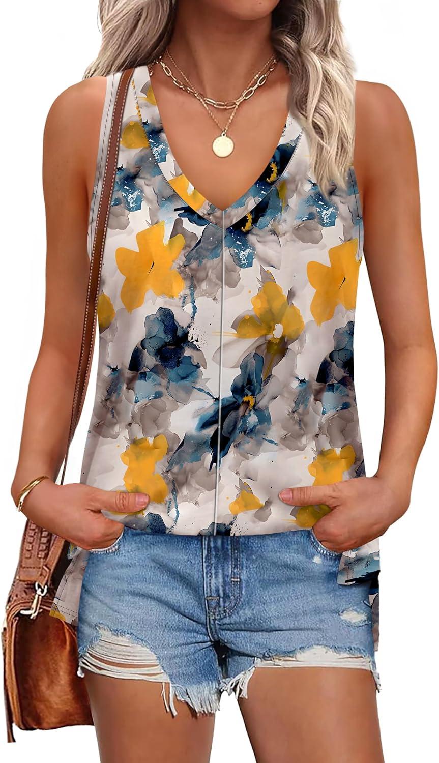 XIEERDUO Tank Tops for Women V Neck Summer Outfits Side Slit Sleeveless Shirts Loose Fit 2025 Fashion(11 Floral 03)