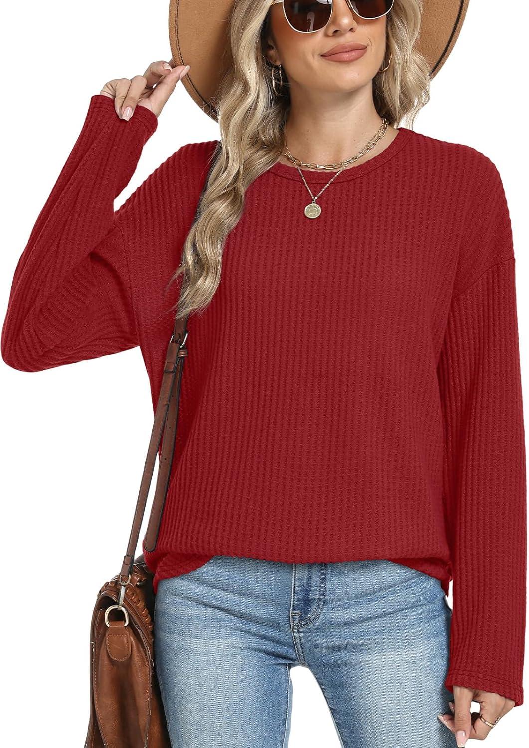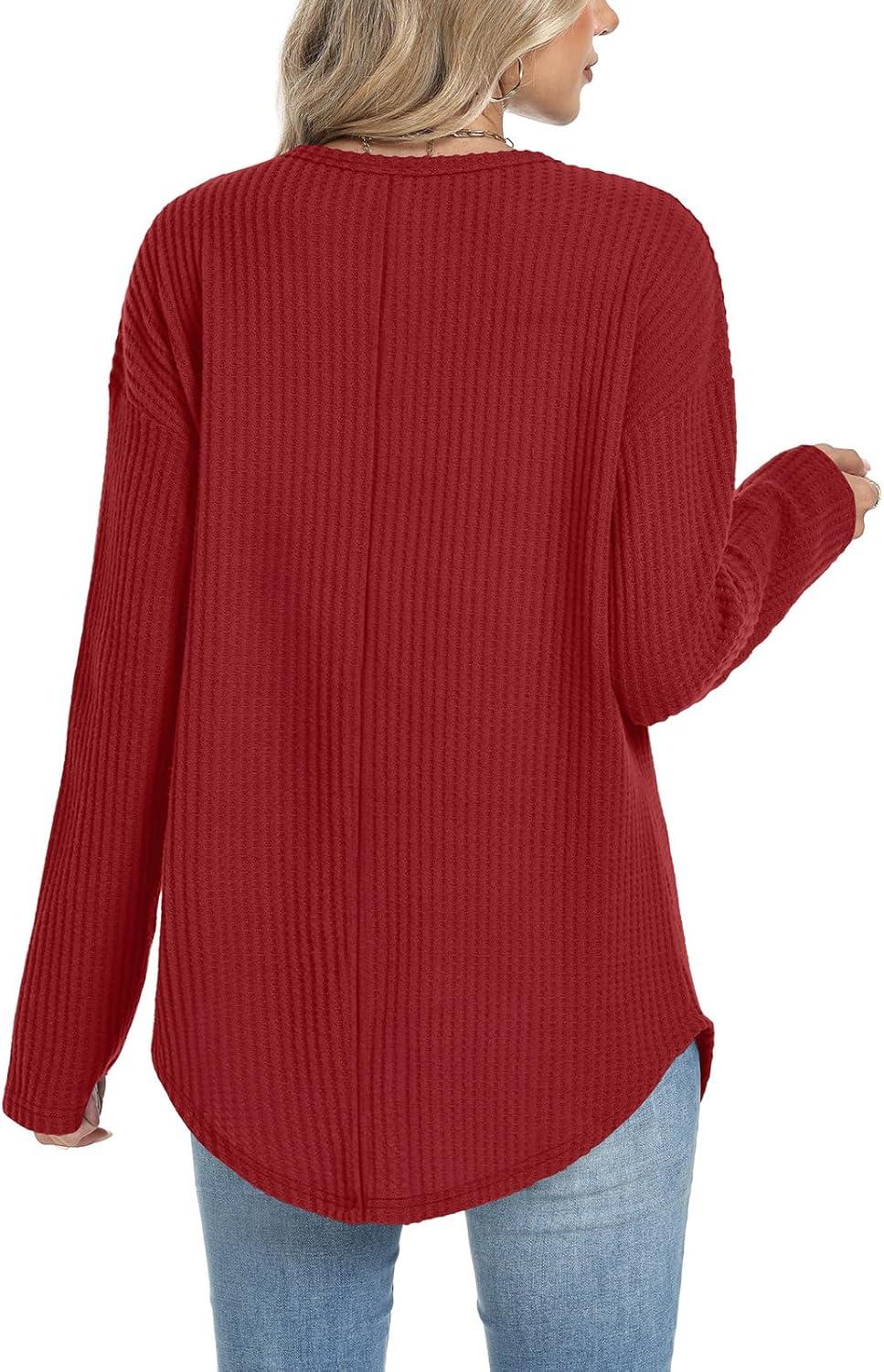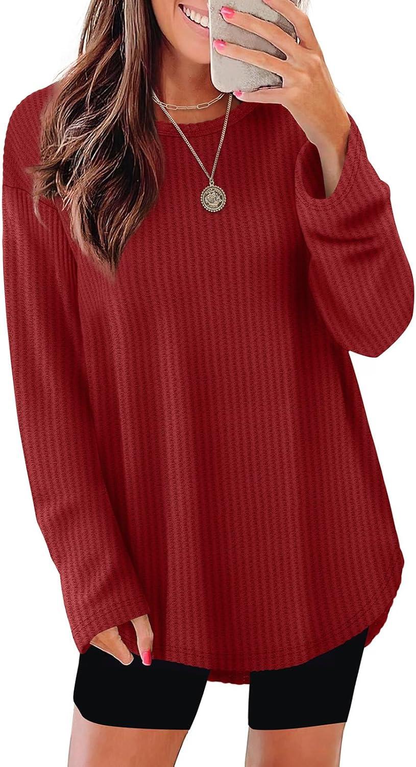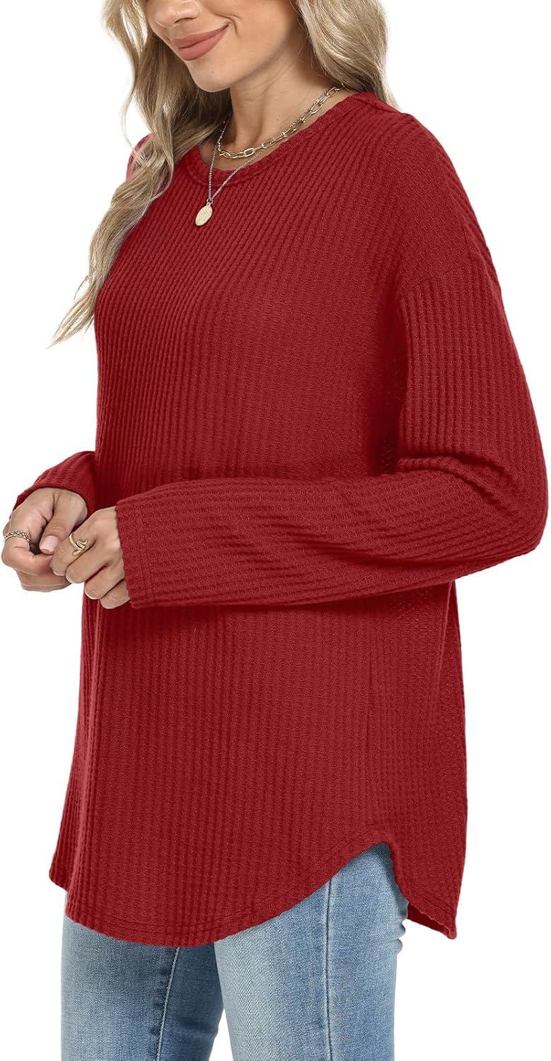 XIEERDUO Women Tunic Tops Dressy Casual Long Sleeve Shirts Fall Trendy Waffle Knit Crewneck Curved Hem Fashion Clothing 2025(G-burgundy)