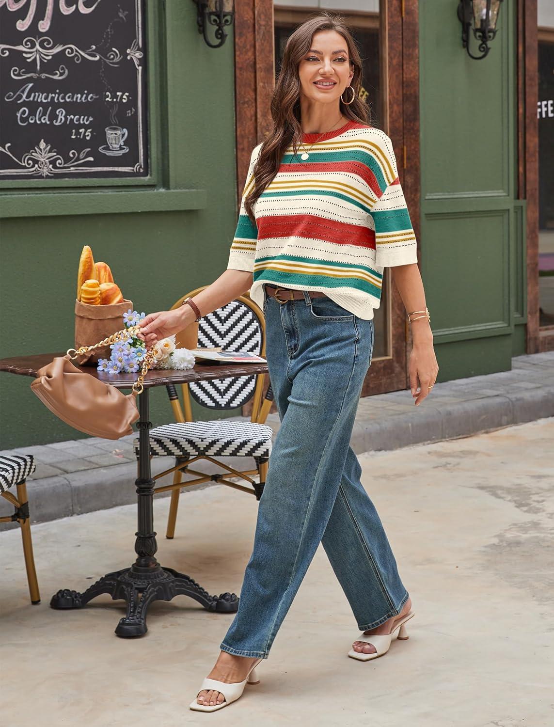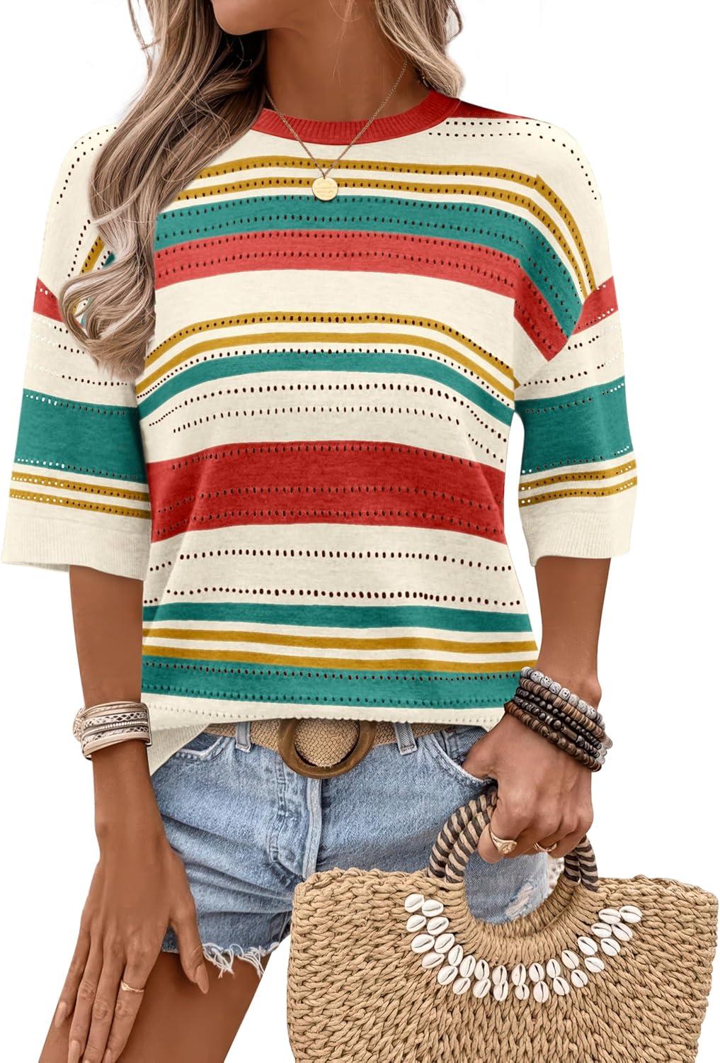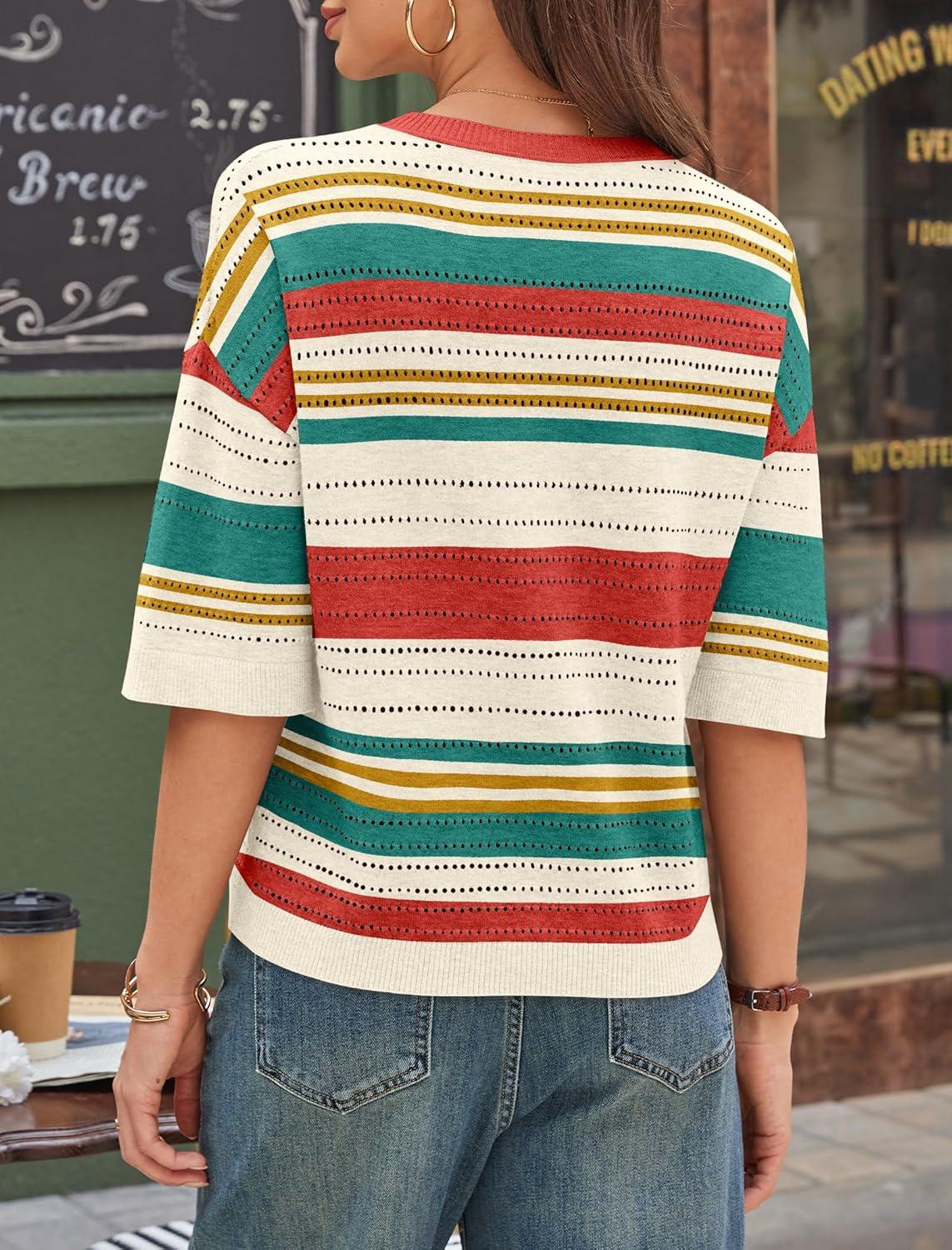 XIEERDUO Womens Half Sleeve Sweater Knit Crochet Blouses Tops 2026 Spring Summer Fashion Clothing Outfits(A-red Green Stripe)
