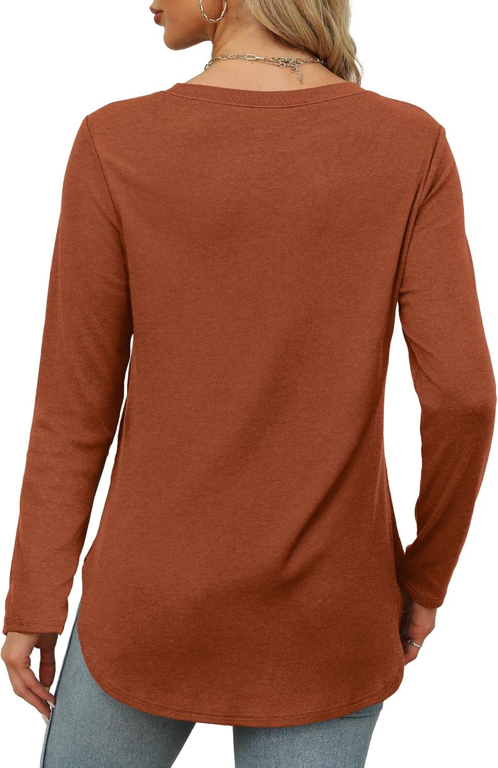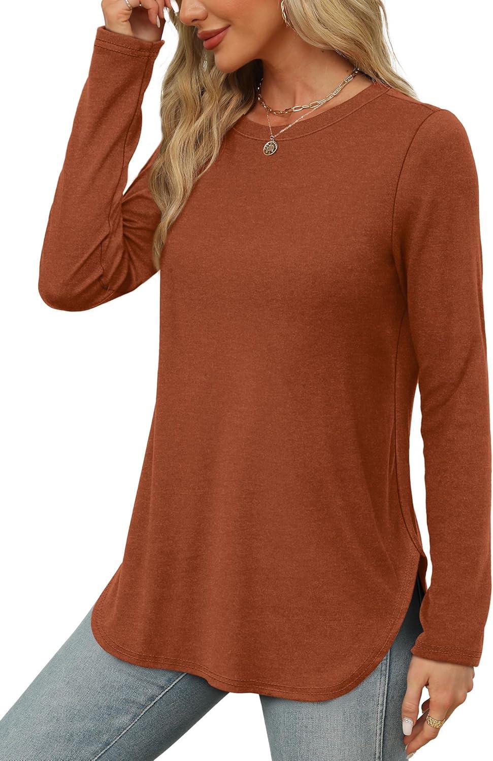 XIEERDUO Womens Long Sleeve Round Neck Shirts Side Split Basic Loose Tunic Tops Casual 2025(Caramel)