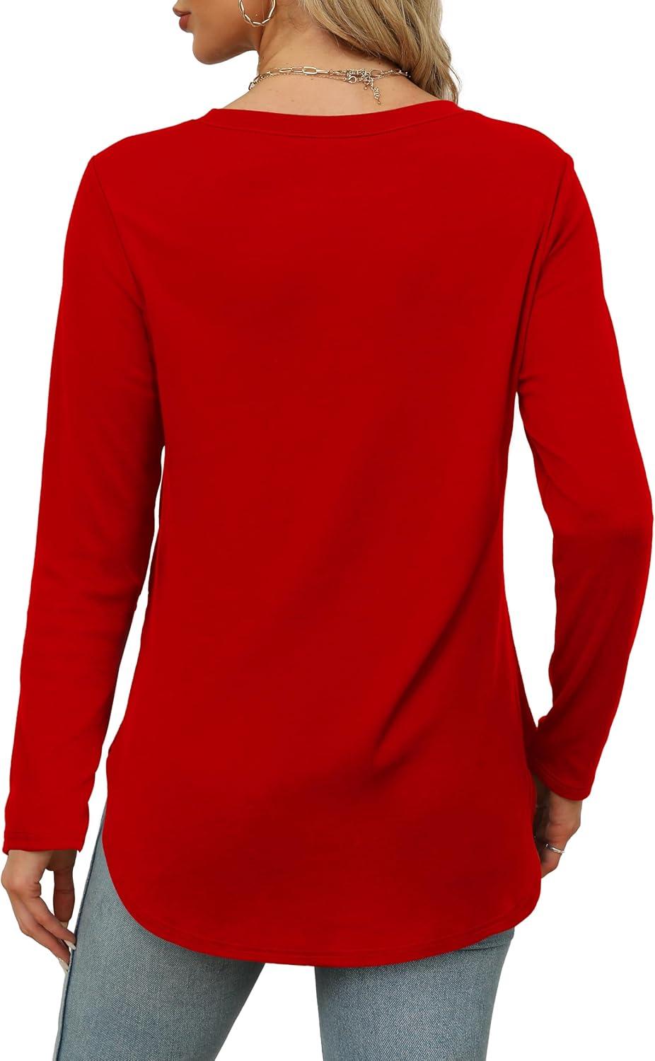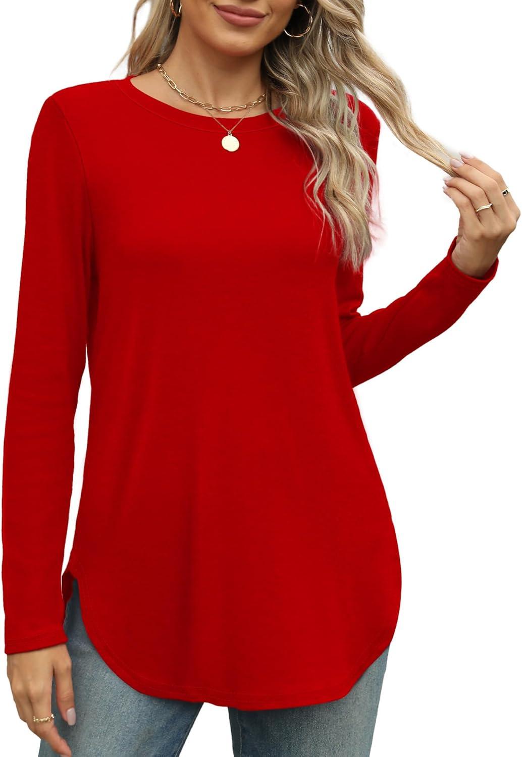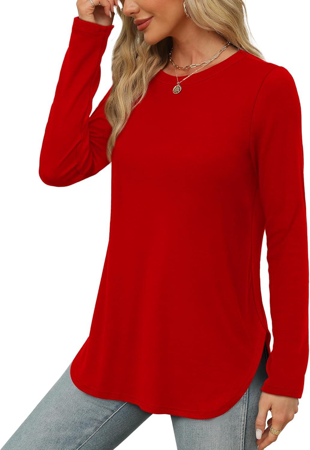 XIEERDUO Womens Long Sleeve Round Neck Shirts Side Split Basic Loose Tunic Tops Casual 2025(Red)