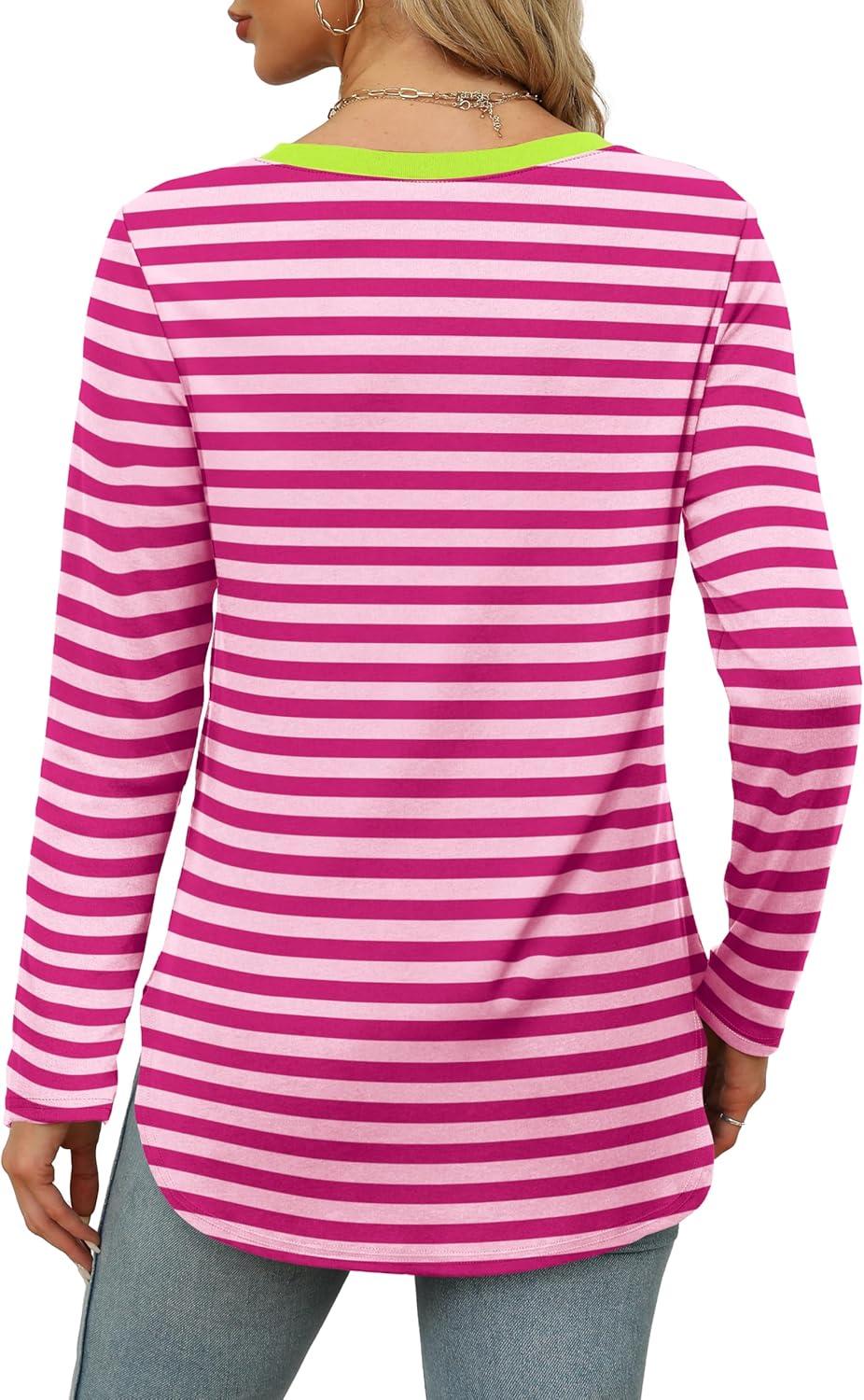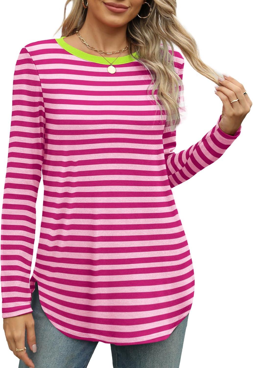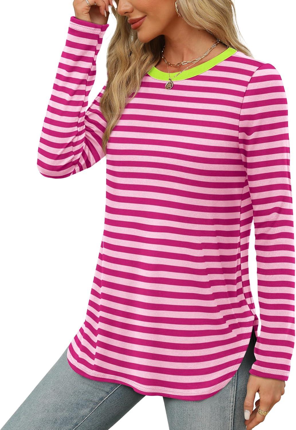 XIEERDUO Womens Long Sleeve Round Neck Shirts Side Split Basic Loose Tunic Tops Casual 2025(Stripe-hot Pink)