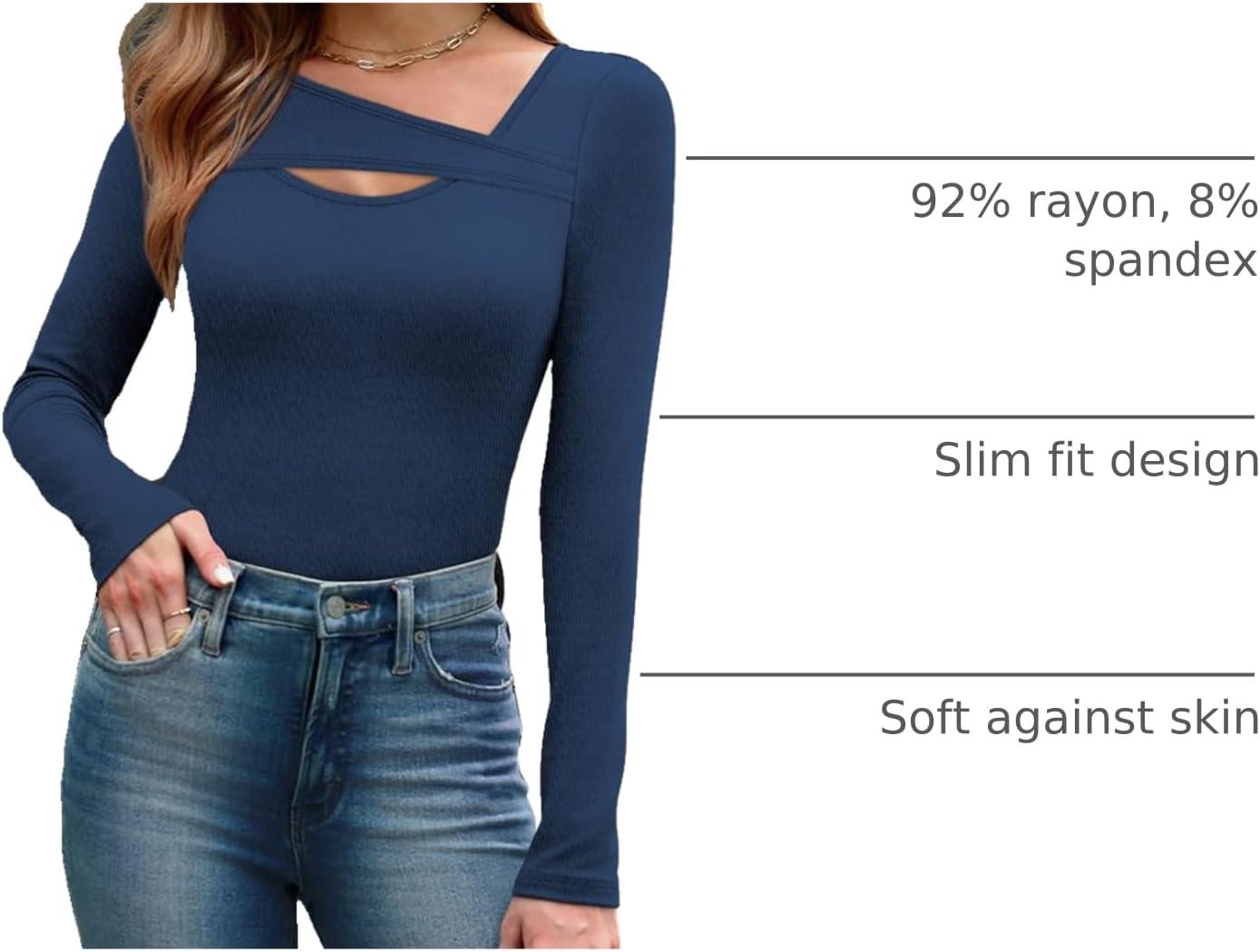XIEERDUO Womens Long Sleeve Tops Slim Fit Fall Tops for Women 2025 Cutout Tops Y2K Ribbed Tshirt(Dark Blue)