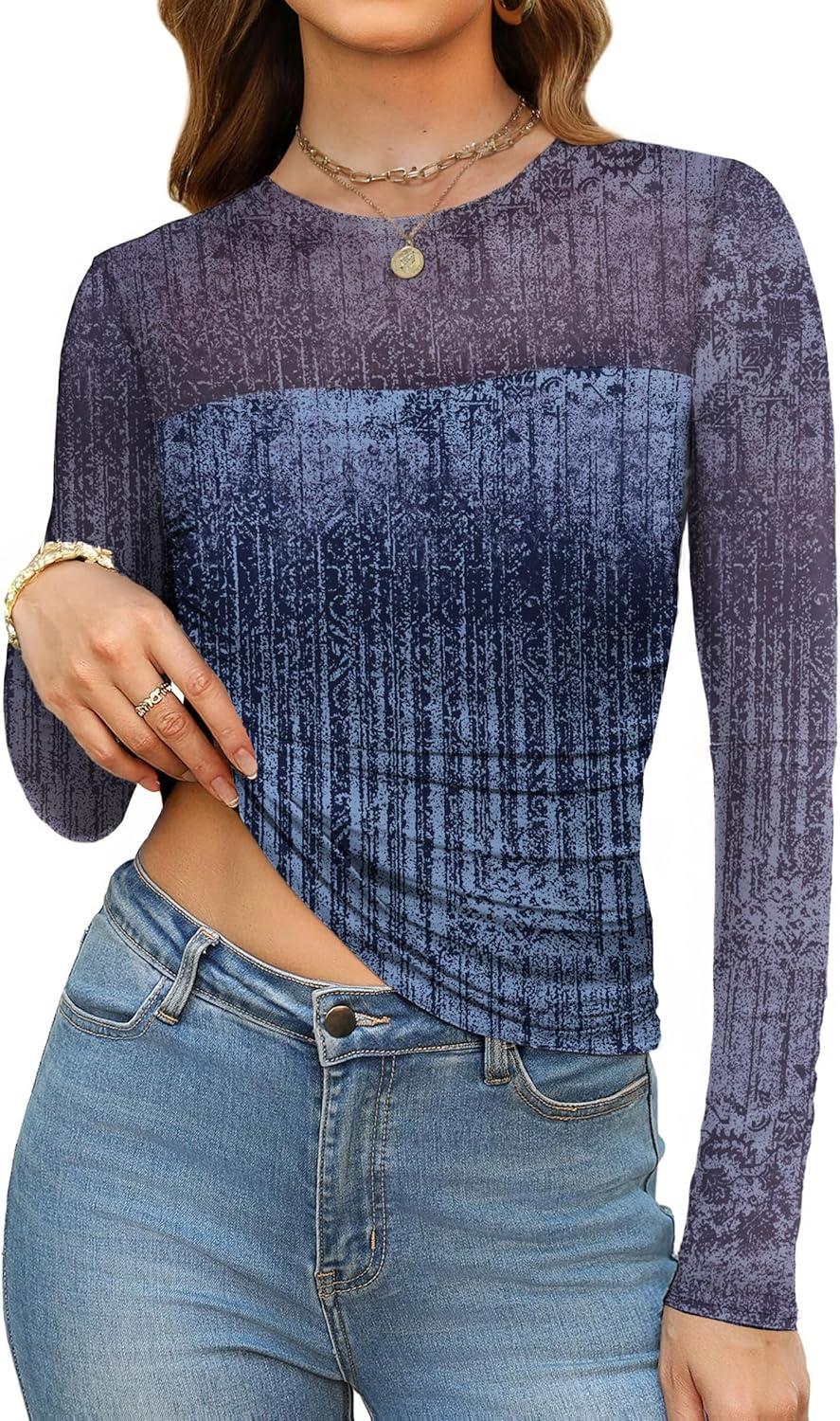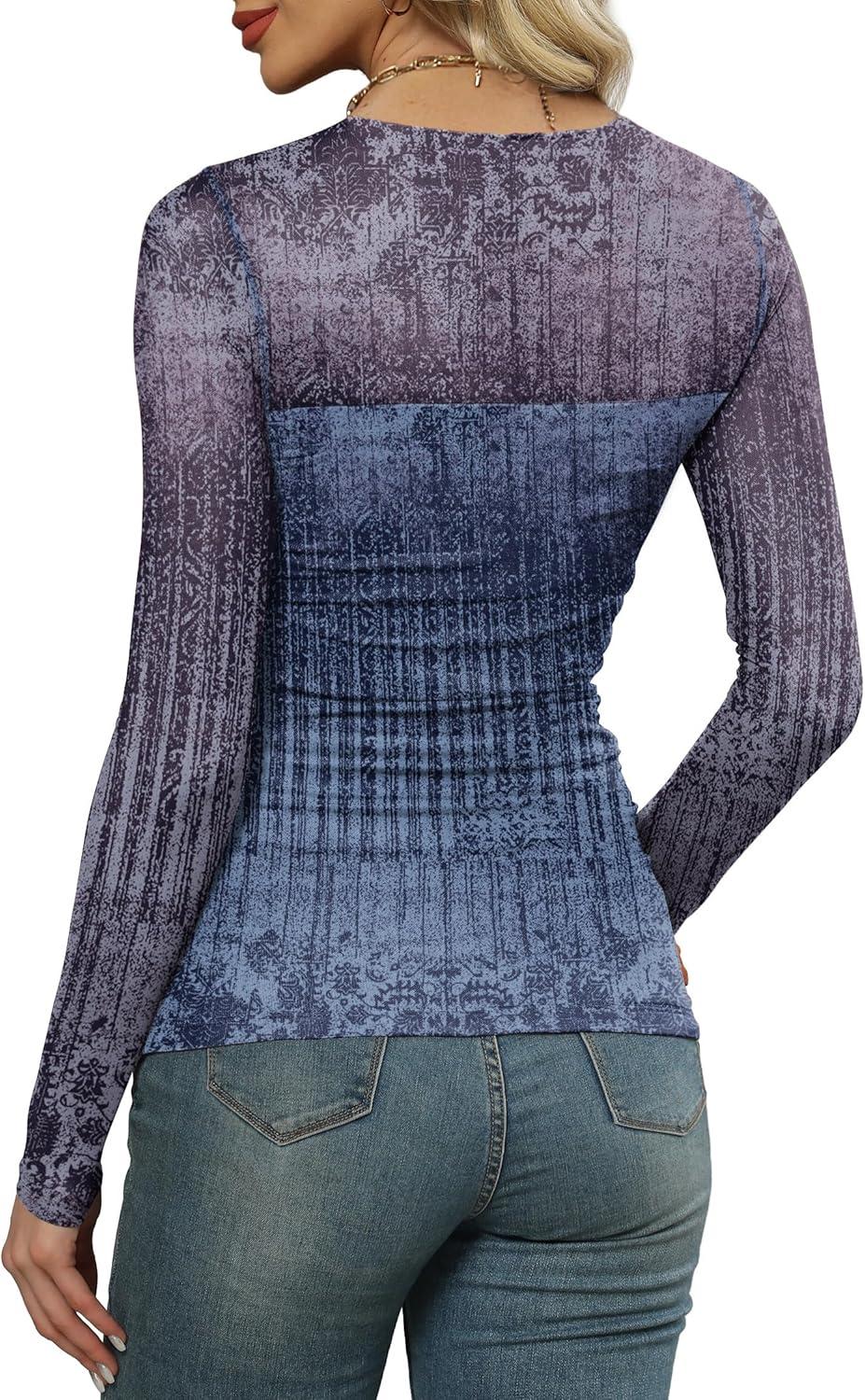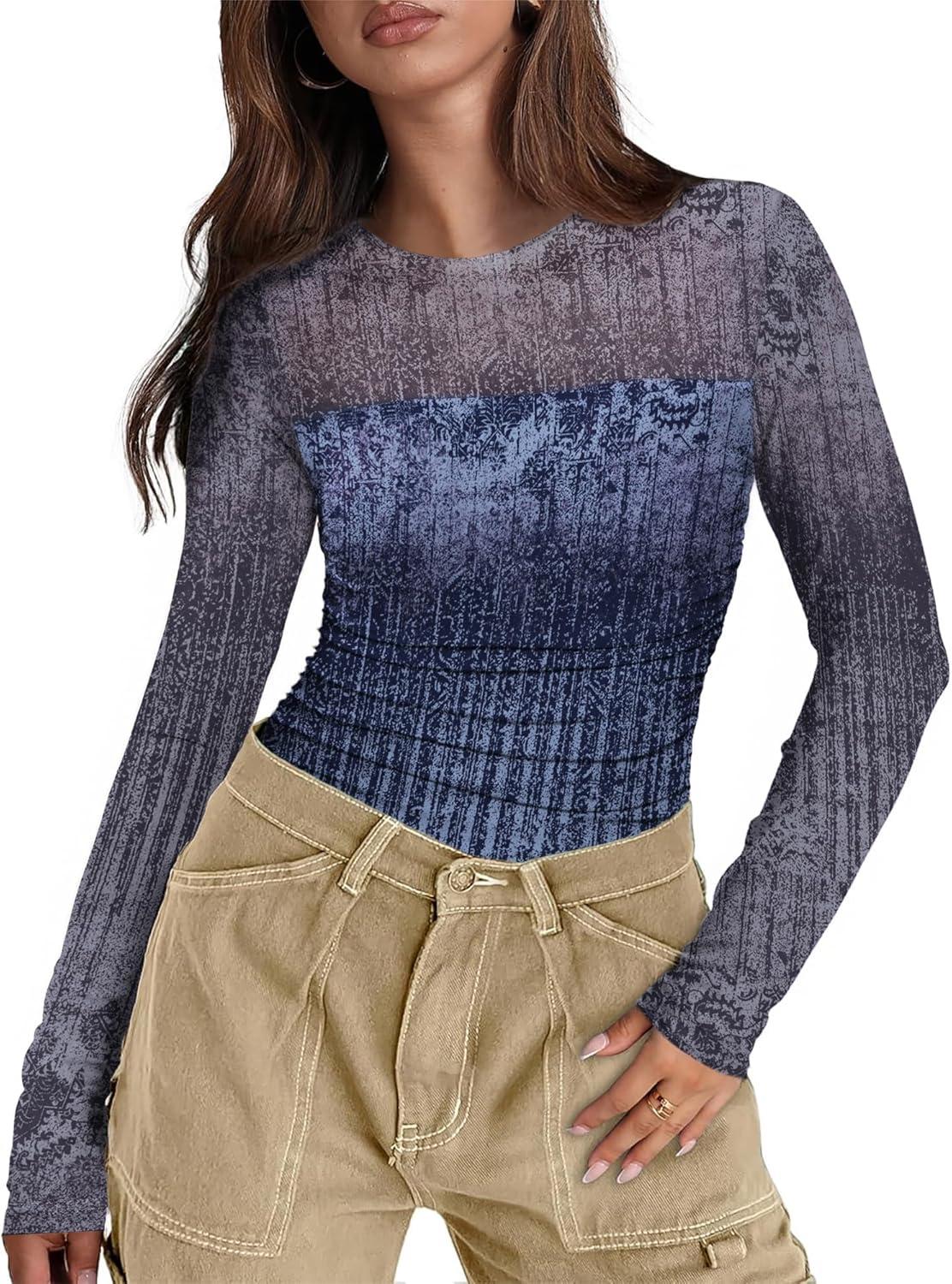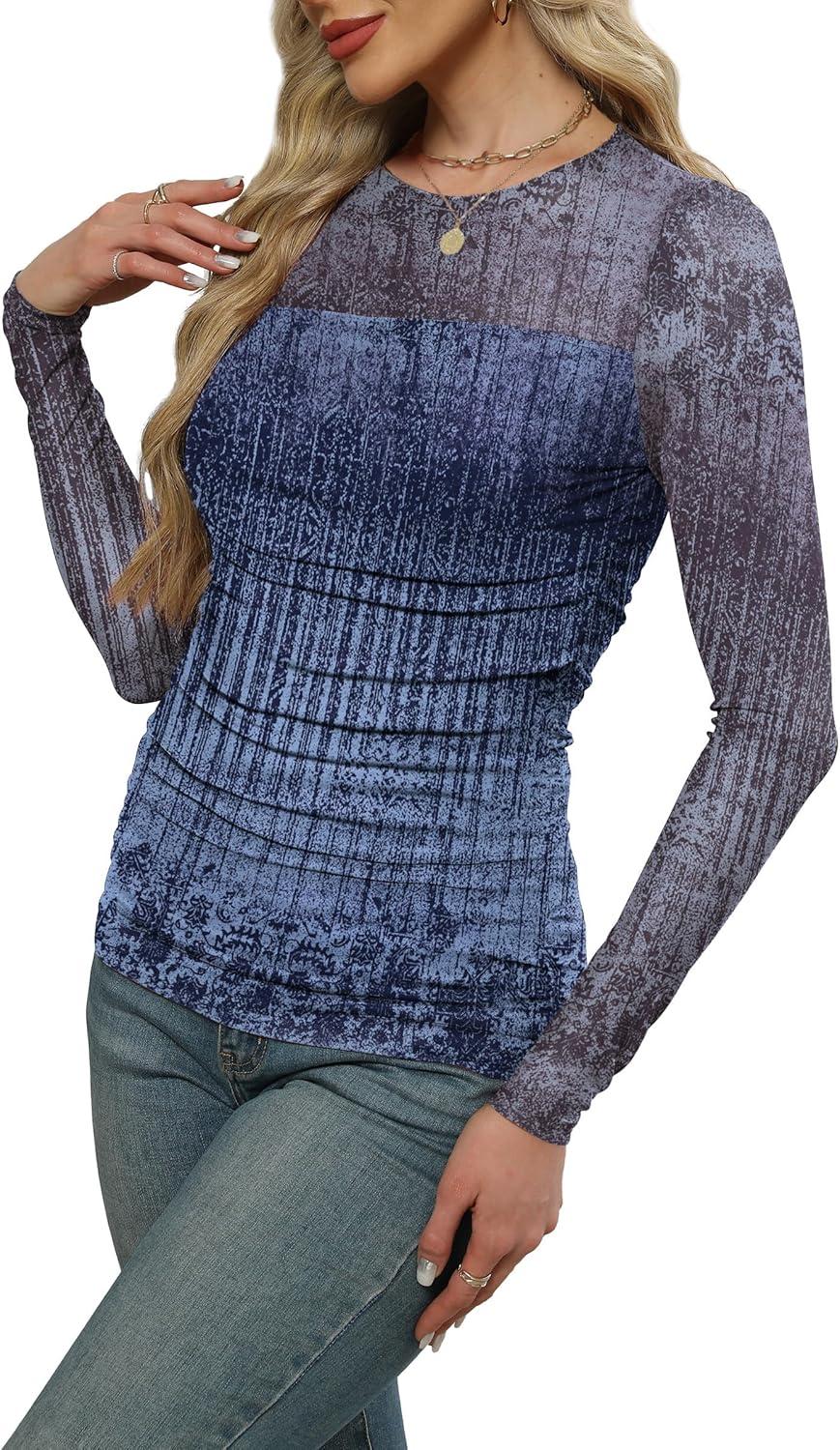 XIEERDUO Women’s Sexy Sheer Long Sleeve Tops Crew Neck Mesh Ruched Going Out Shirts Blouse Date Night Outfits(Z Print Ombre)