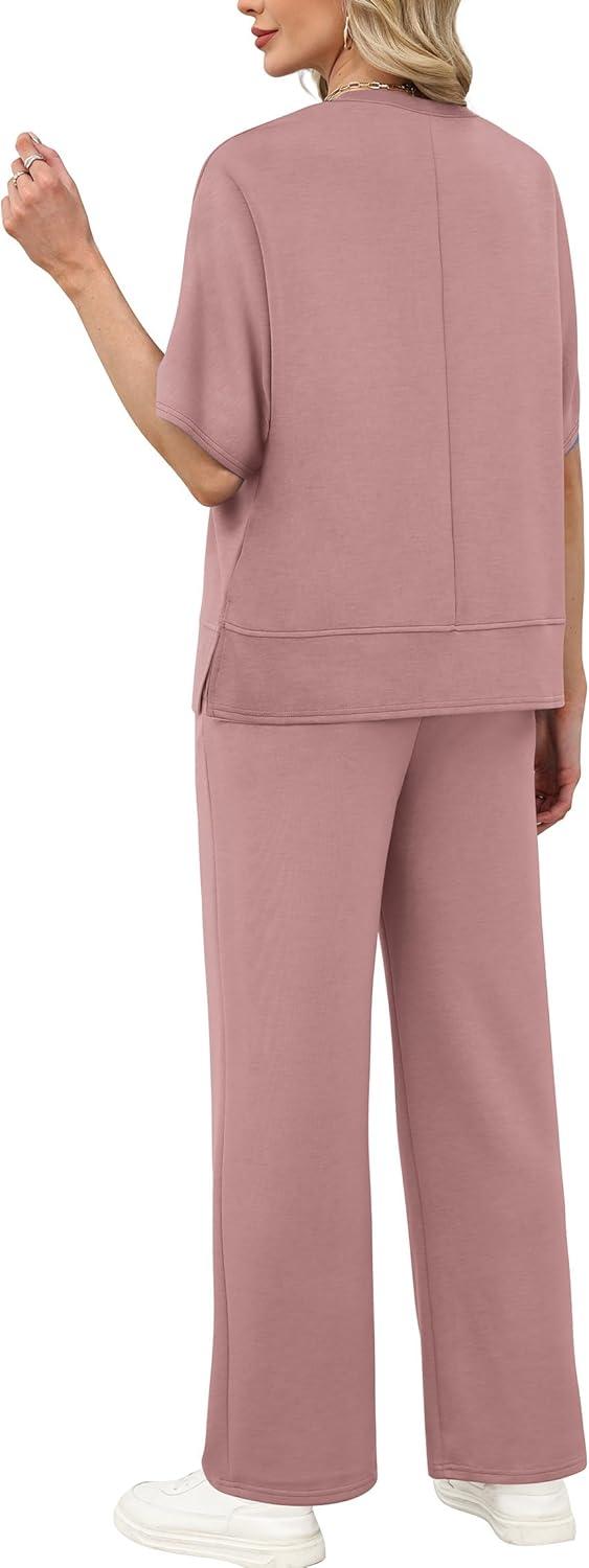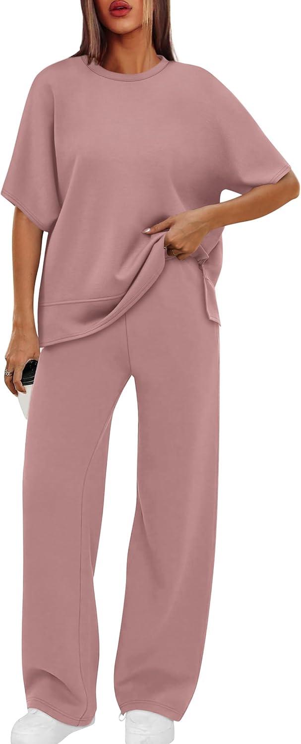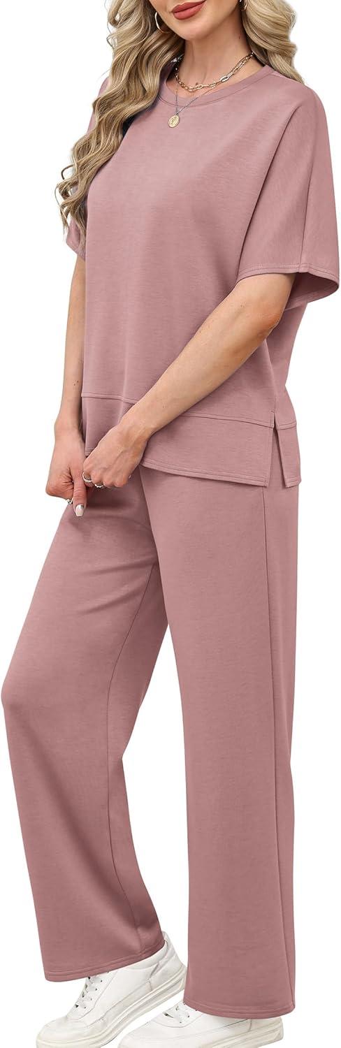 XIEERDUO Women’s Side Slit Lounge Sets 2 Piece Travel Outfits Airport Tracksuit Oversized Wide Leg Loungewear S-3XL(Pink)