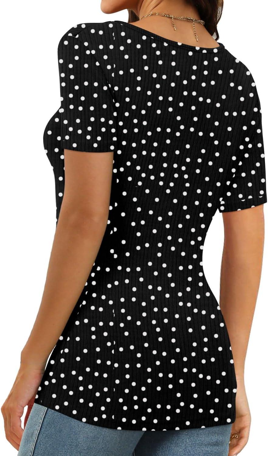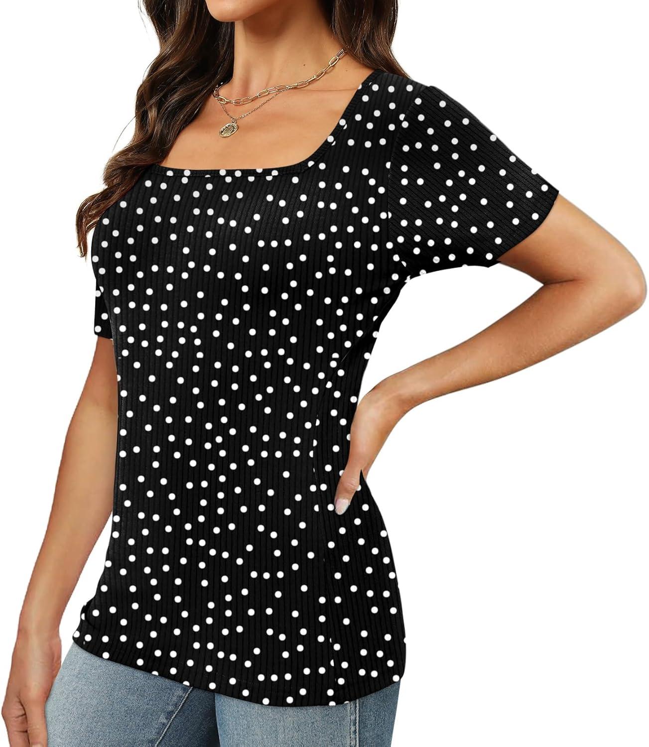 XIEERDUO Womens Square Neck Short/Long SleeveTops 2024 Spring Summer Slim Fit Tees Shirts(A Short Sleeve Print Dots)