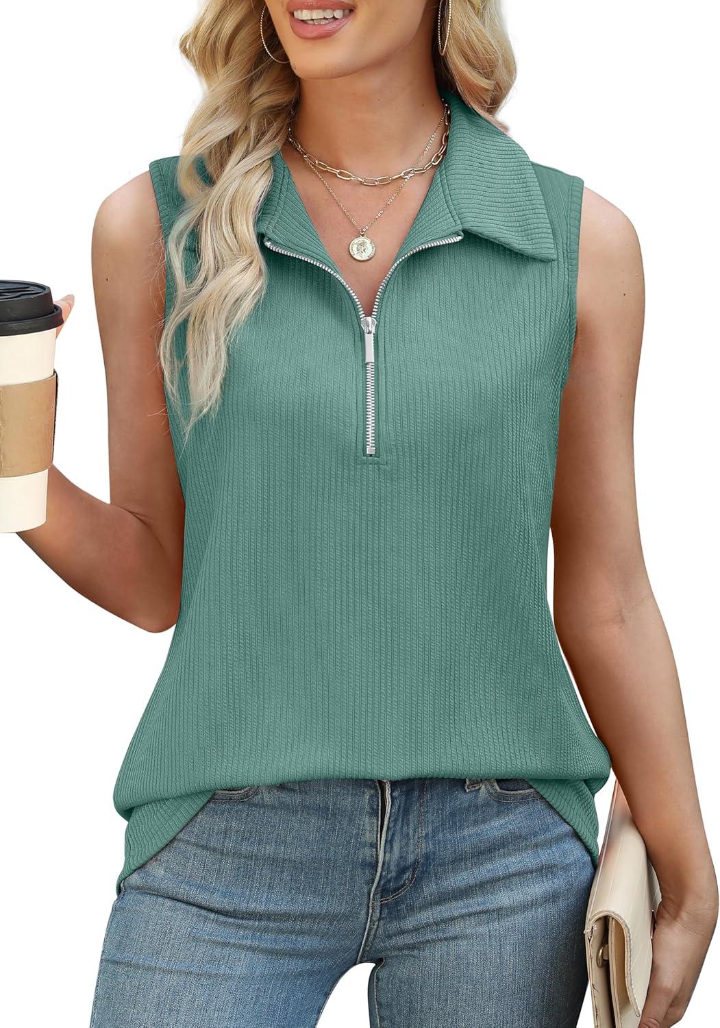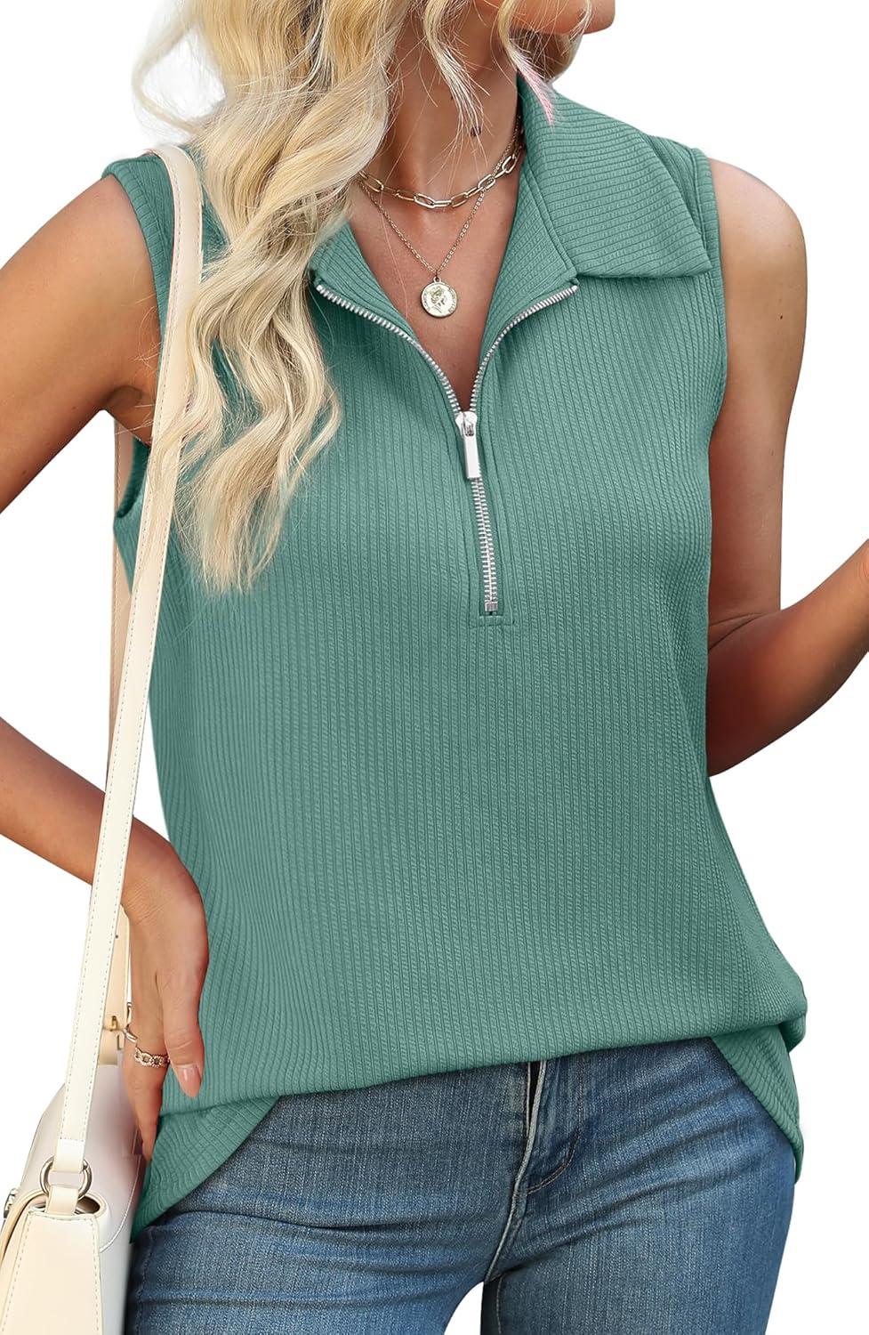 XIEERDUO Womens Summer Tops V Neck Collared Shirts Dressy Casual Ribbed Tank Top with Zipper Loose Fit(Grey Green)