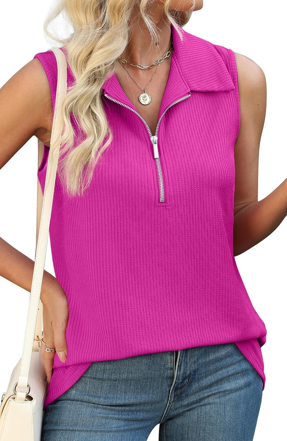 XIEERDUO Womens Summer Tops V Neck Collared Shirts Dressy Casual Ribbed Tank Top with Zipper Loose Fit(Hot Pink)