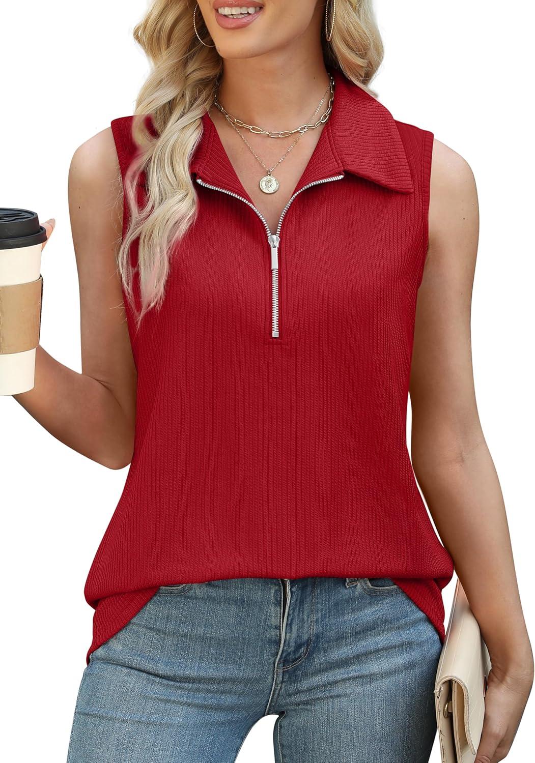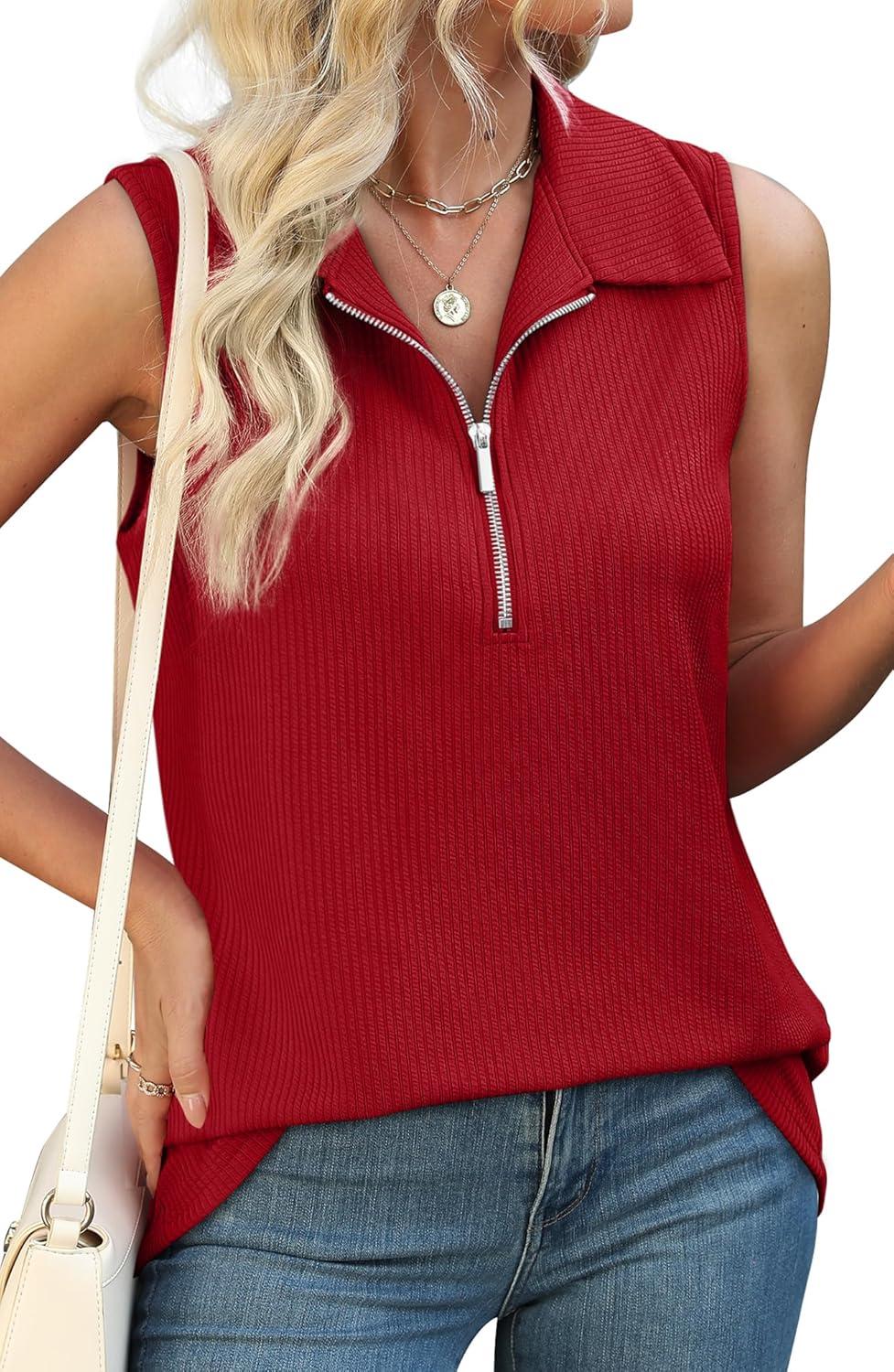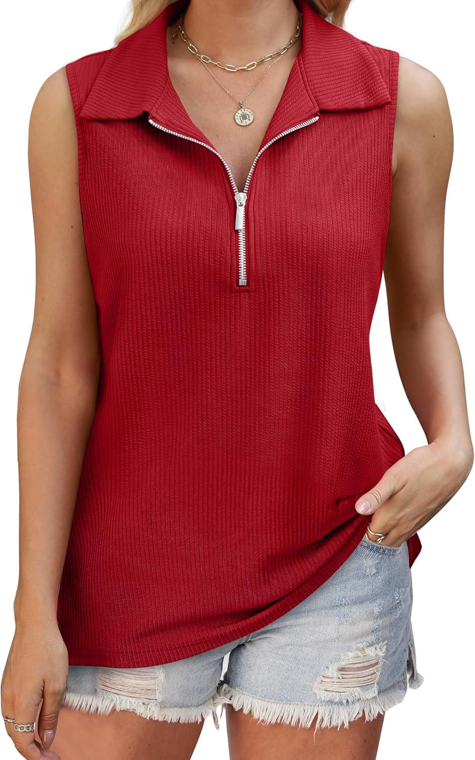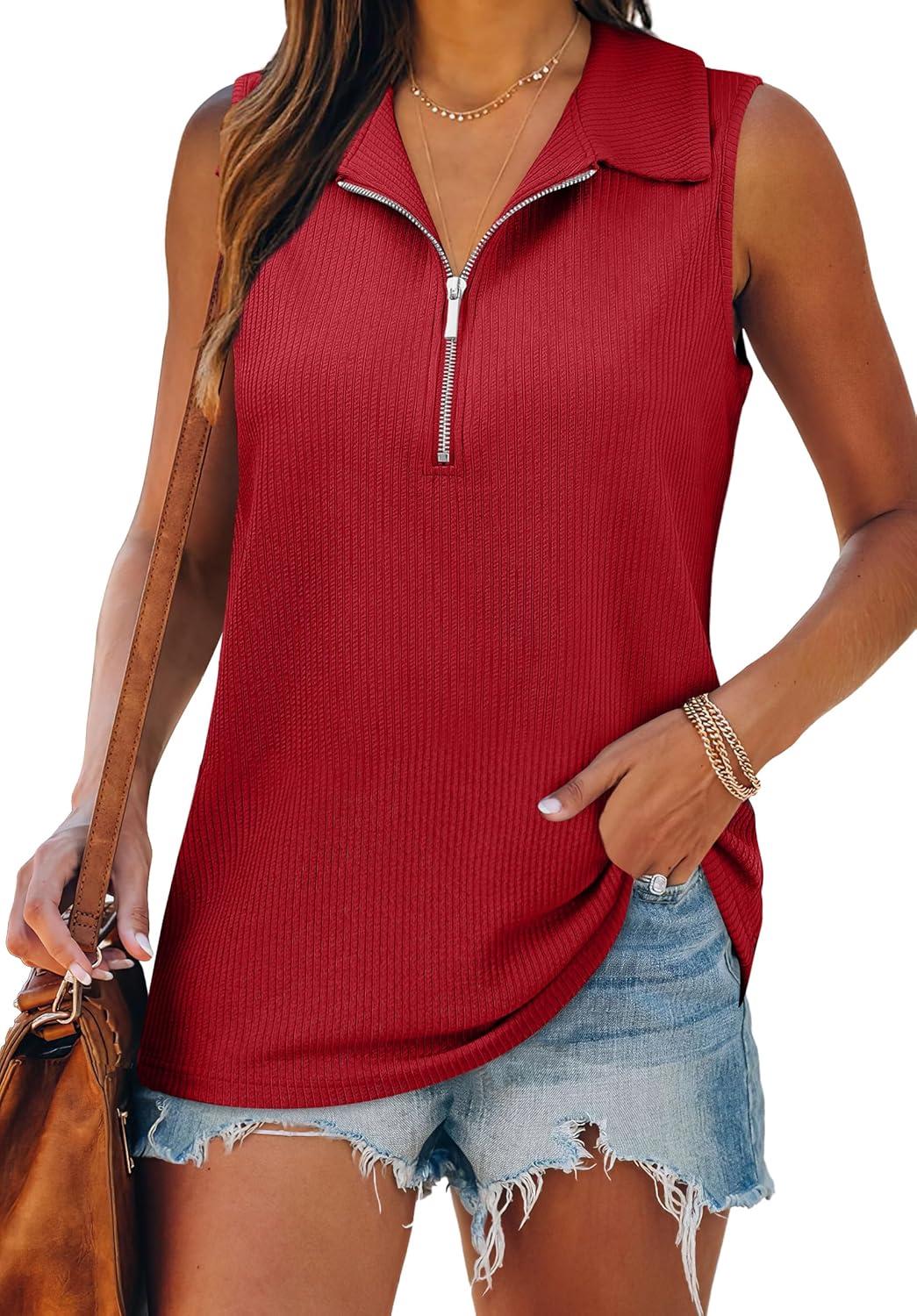 XIEERDUO Womens Summer Tops V Neck Collared Shirts Dressy Casual Ribbed Tank Top with Zipper Loose Fit(Red)