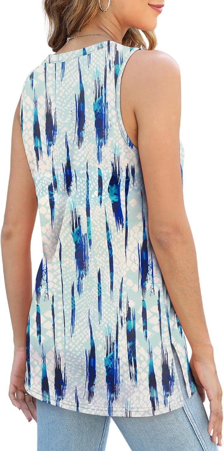 XIEERDUO Womens Tank Tops Crewneck Loose Fit Basic Casual Summer Side Split Sleeveless Shirts(Eb-blue Printed)