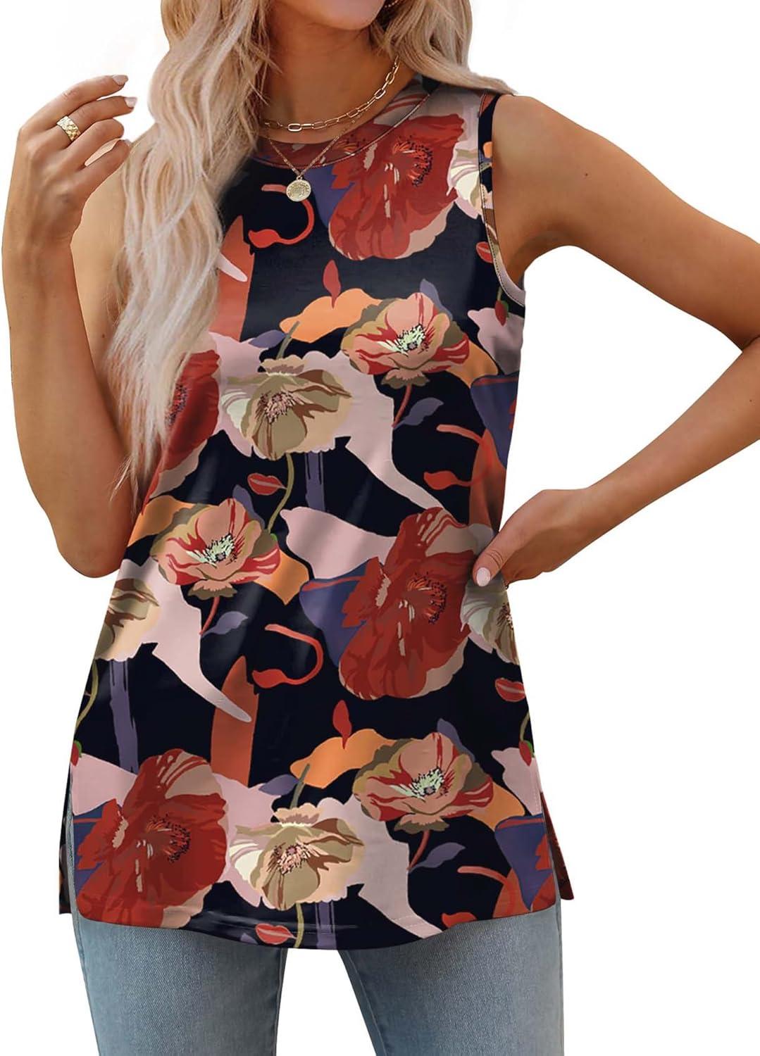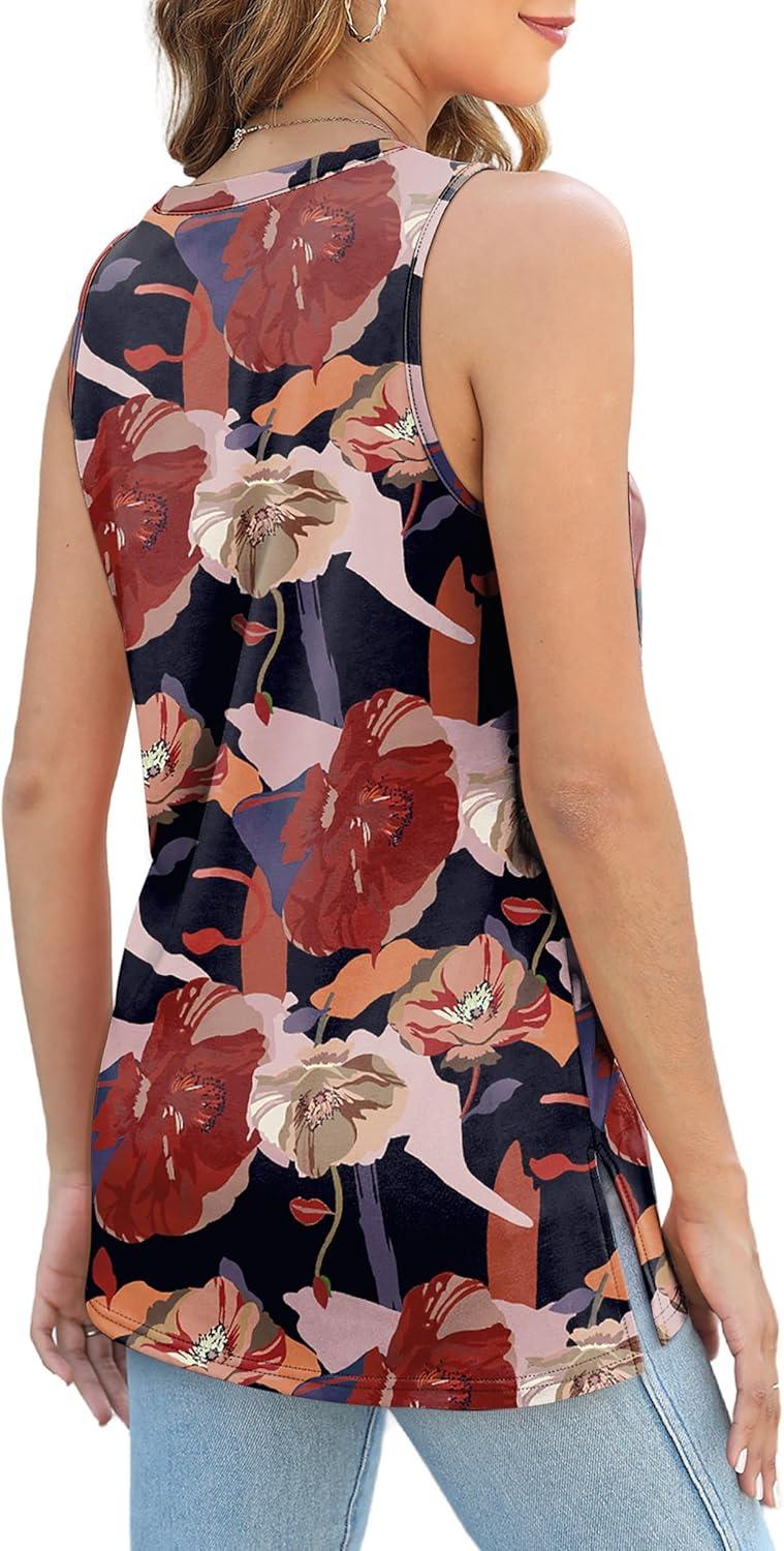 XIEERDUO Womens Tank Tops Crewneck Loose Fit Basic Casual Summer Side Split Sleeveless Shirts(H-khaki Floral)