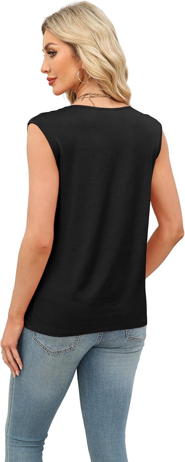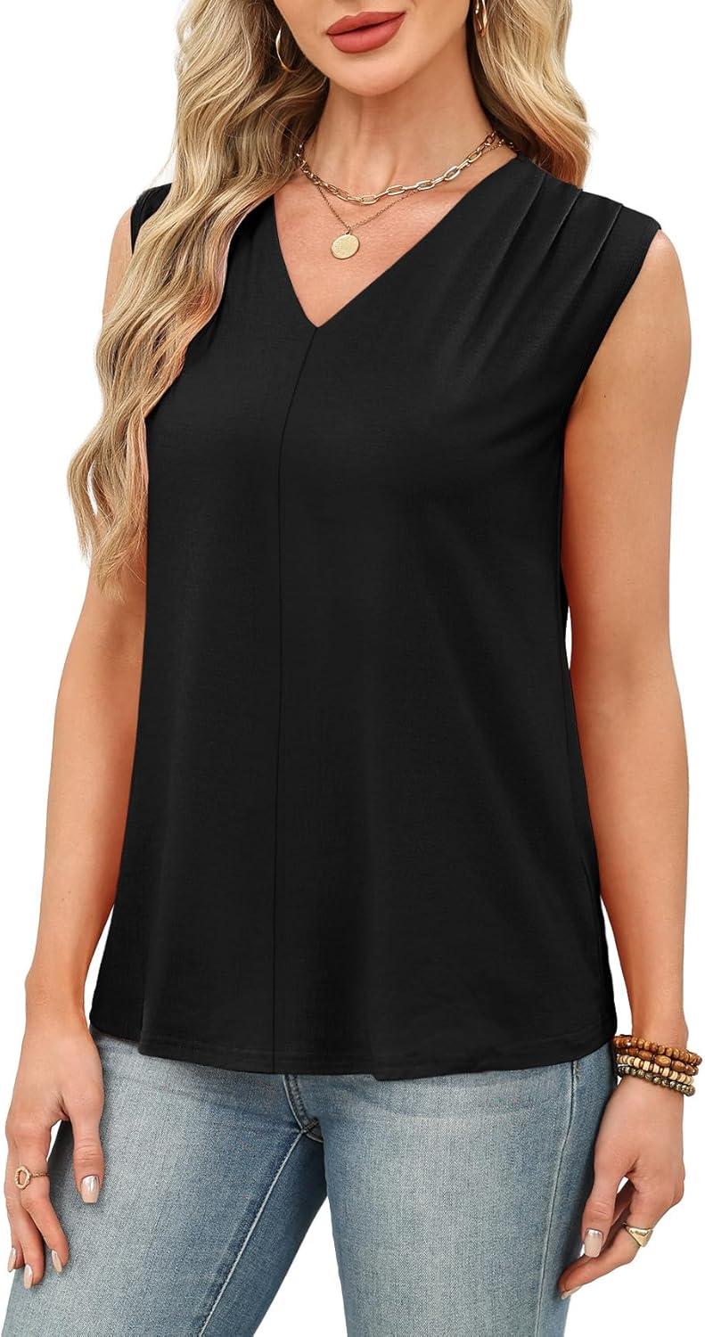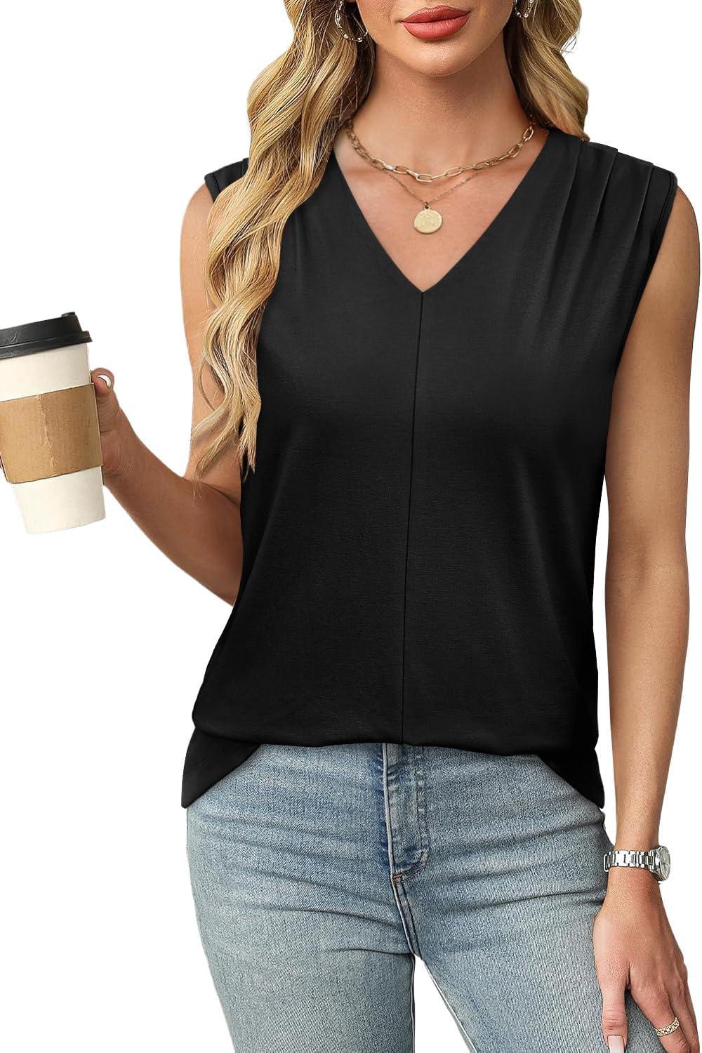 XIEERDUO Womens Tank Tops Loose Fit Casual Fashion Summer Soft Pleated V Neck Sleeveless Blouses(A-black)
