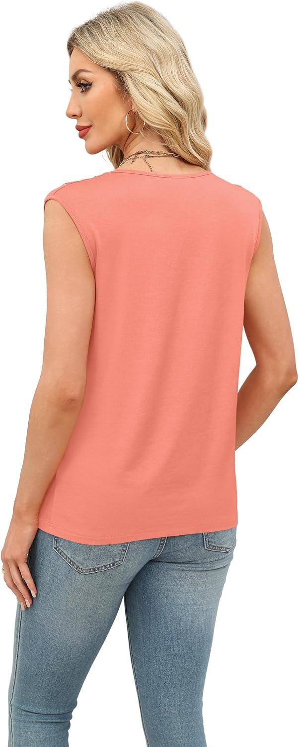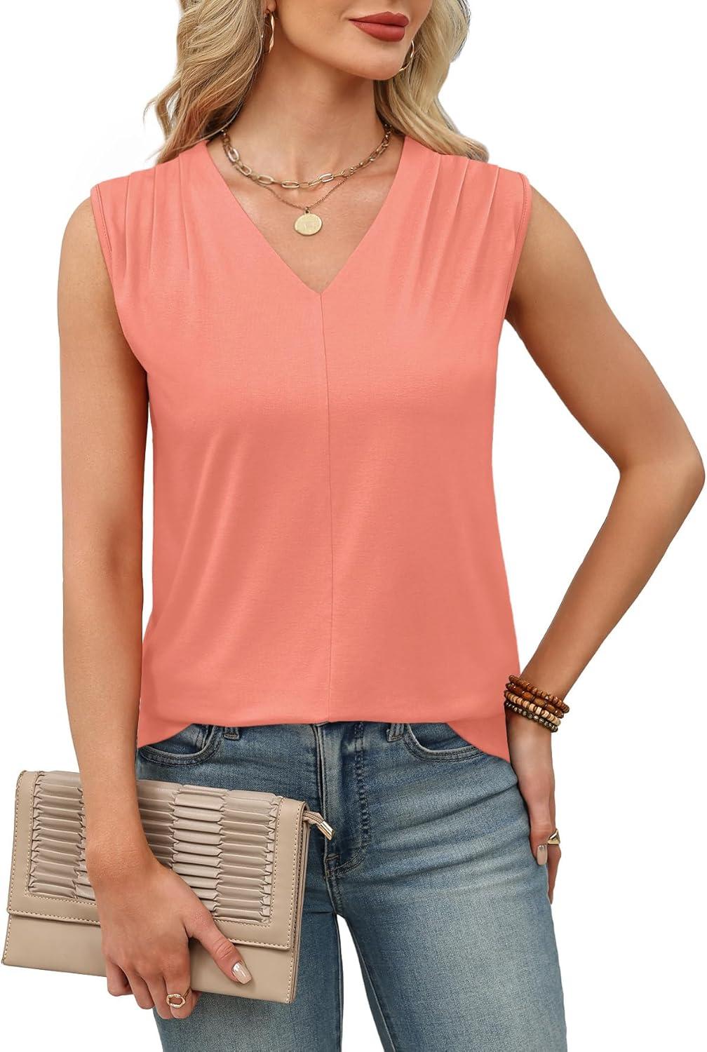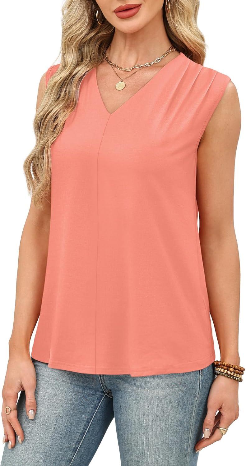 XIEERDUO Womens Tank Tops Loose Fit Casual Fashion Summer Soft Pleated V Neck Sleeveless Blouses(Pink)