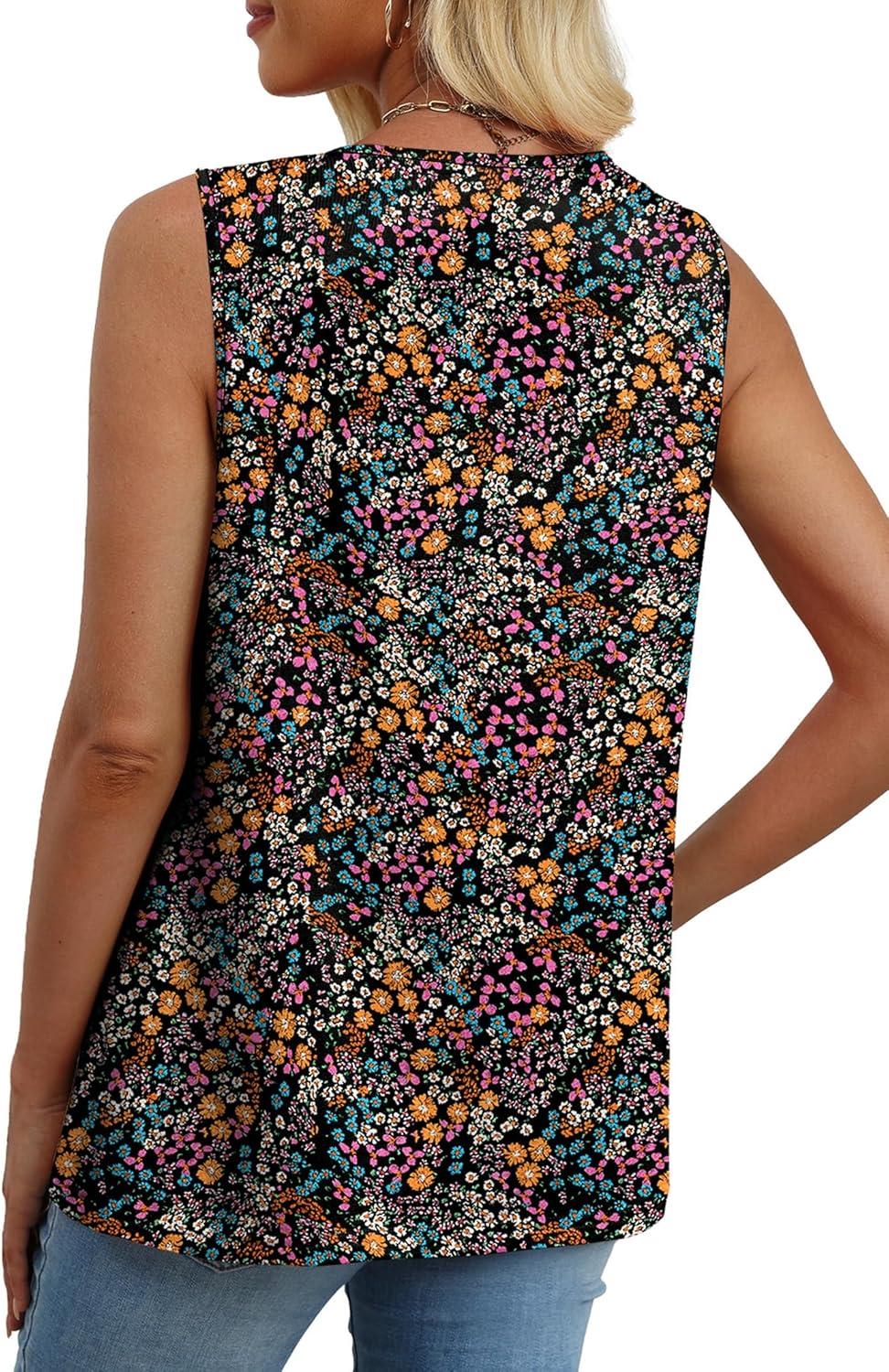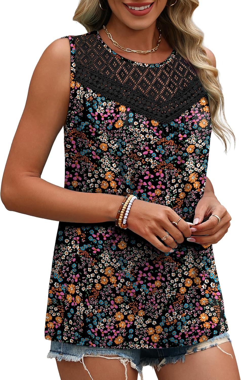 XIEERDUO Womens Tank Tops Sleeveless Lace Crochet Boho Tops Loose Fit Pleated Tunics Crewneck Summer Vacation Outfits Flowy(Patterned-black Floral)