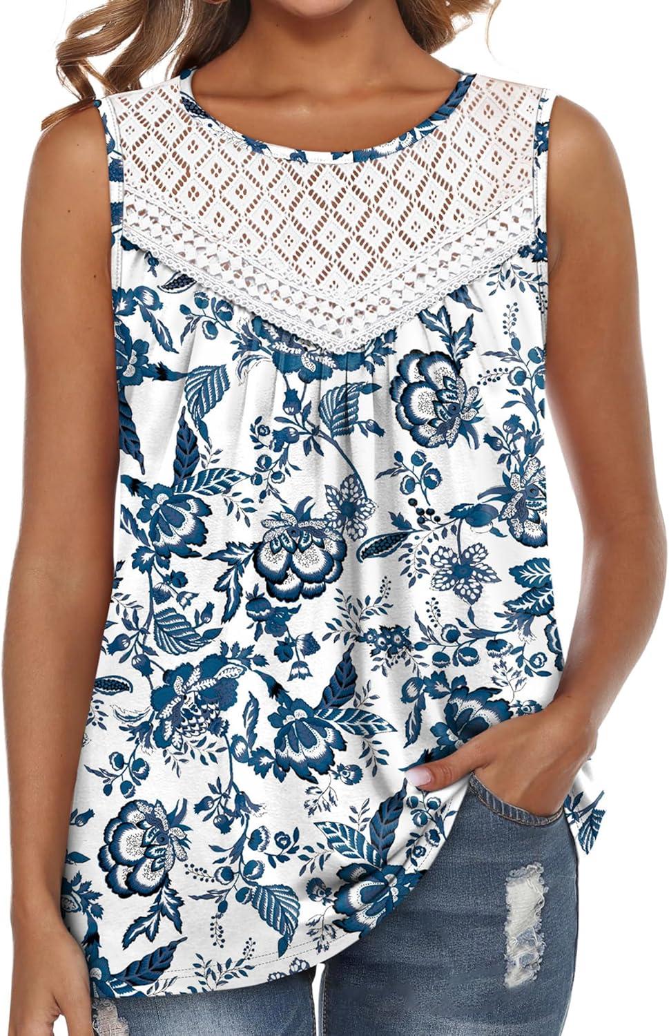 XIEERDUO Womens Tank Tops Sleeveless Lace Crochet Boho Tops Loose Fit Pleated Tunics Crewneck Summer Vacation Outfits Flowy(Patterned-blue Print)