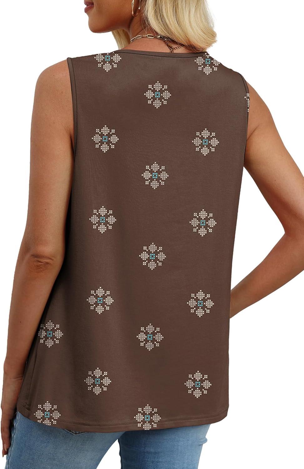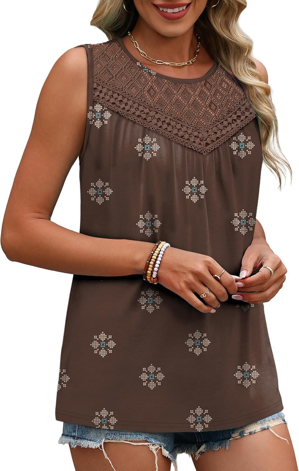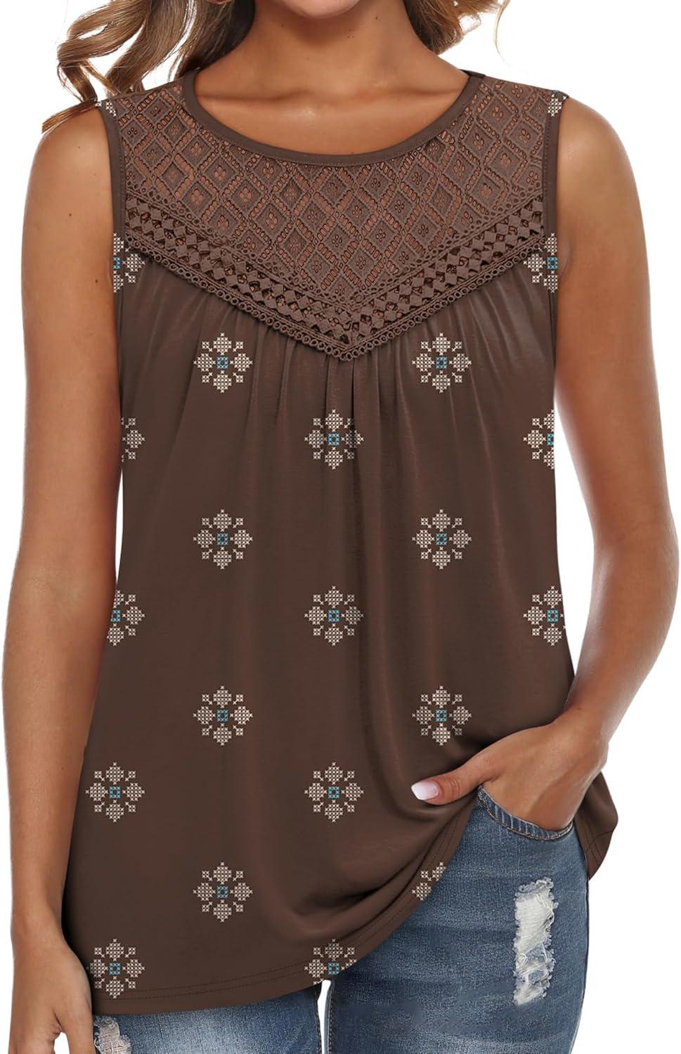 XIEERDUO Womens Tank Tops Sleeveless Lace Crochet Boho Tops Loose Fit Pleated Tunics Crewneck Summer Vacation Outfits Flowy(Patterned-brown Print)