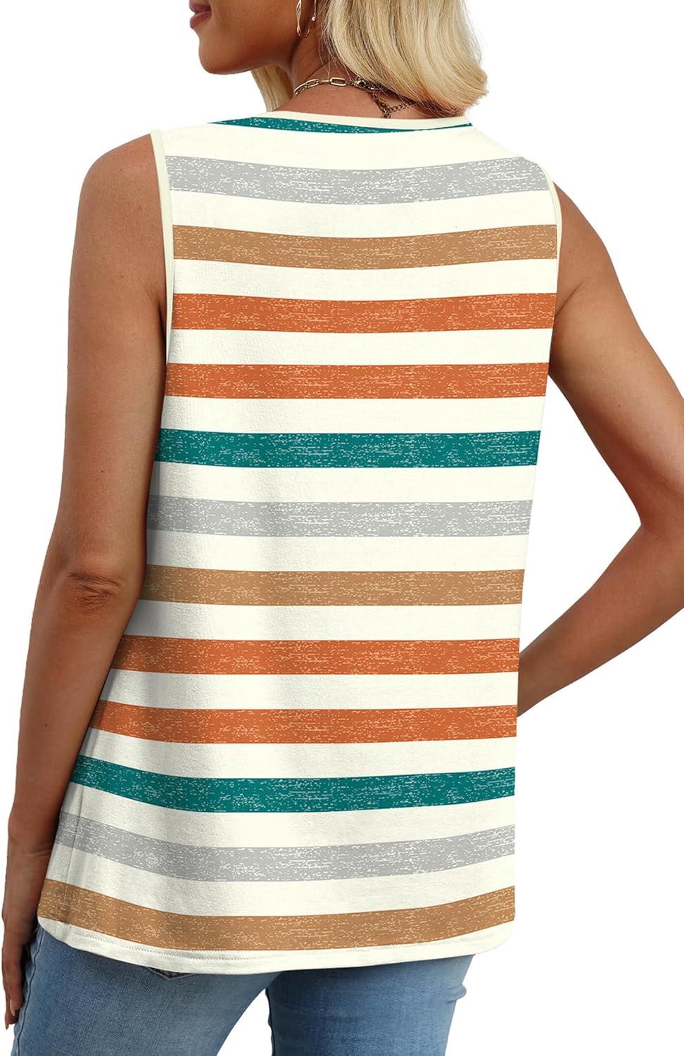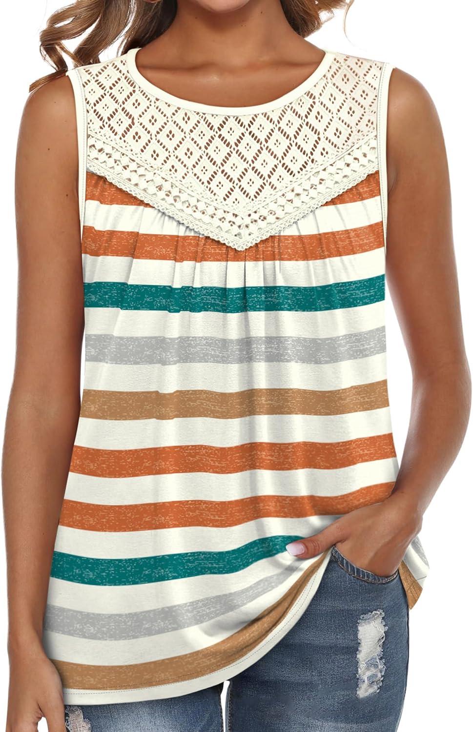 XIEERDUO Womens Tank Tops Sleeveless Lace Crochet Boho Tops Loose Fit Pleated Tunics Crewneck Summer Vacation Outfits Flowy(Patterned-multicolor Stripe)