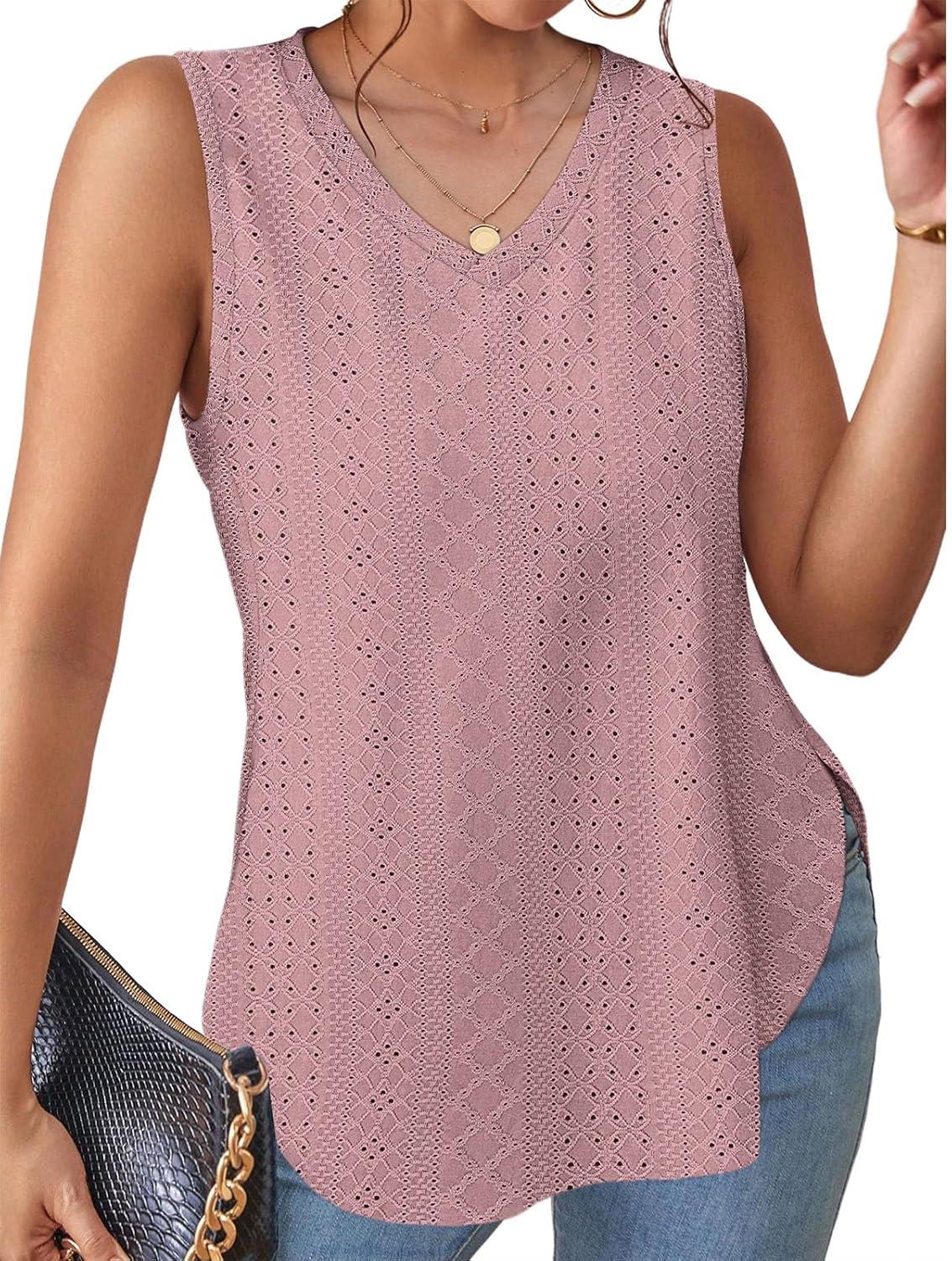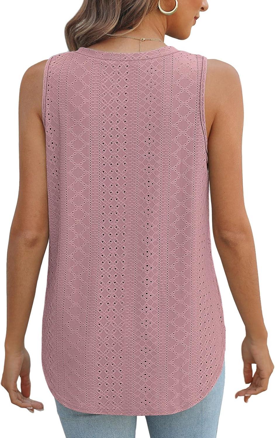 XIEERDUO Womens Tank Tops V Neck Eyelet Embroidery Casaul Sleeveless Shirts(03-pink)