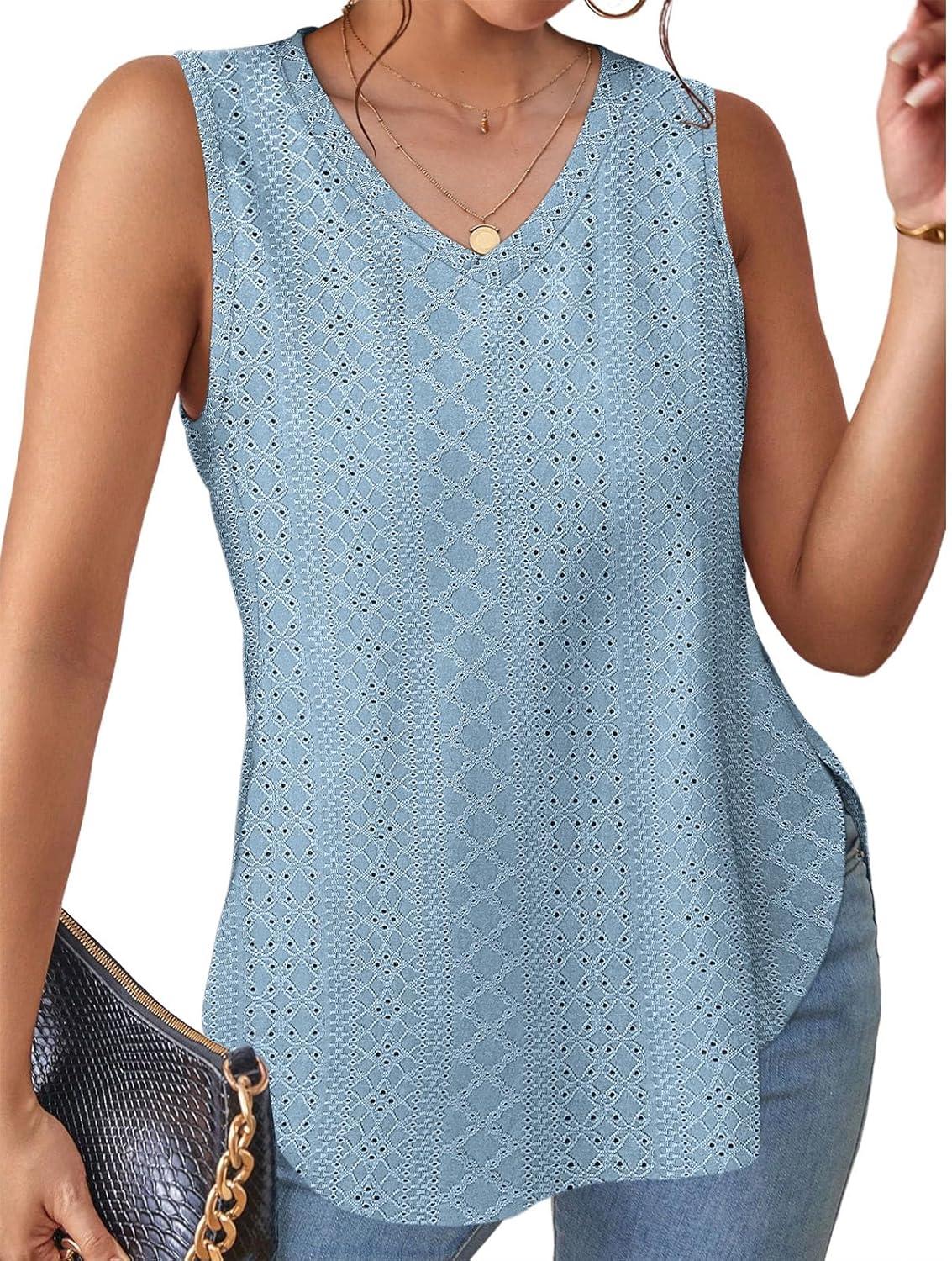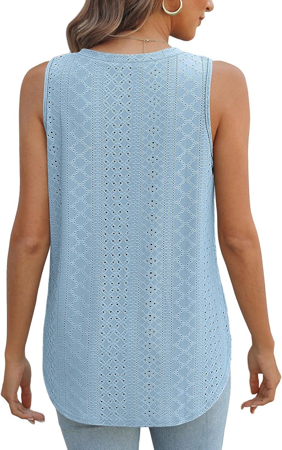 XIEERDUO Womens Tank Tops V Neck Eyelet Embroidery Casaul Sleeveless Shirts(04-blue)