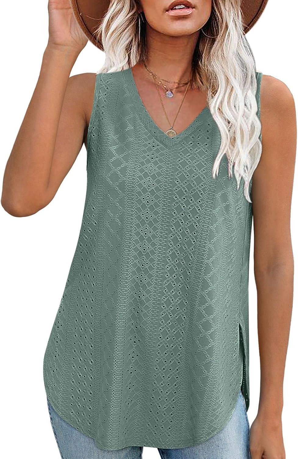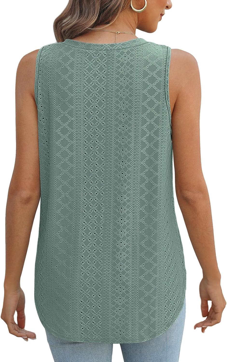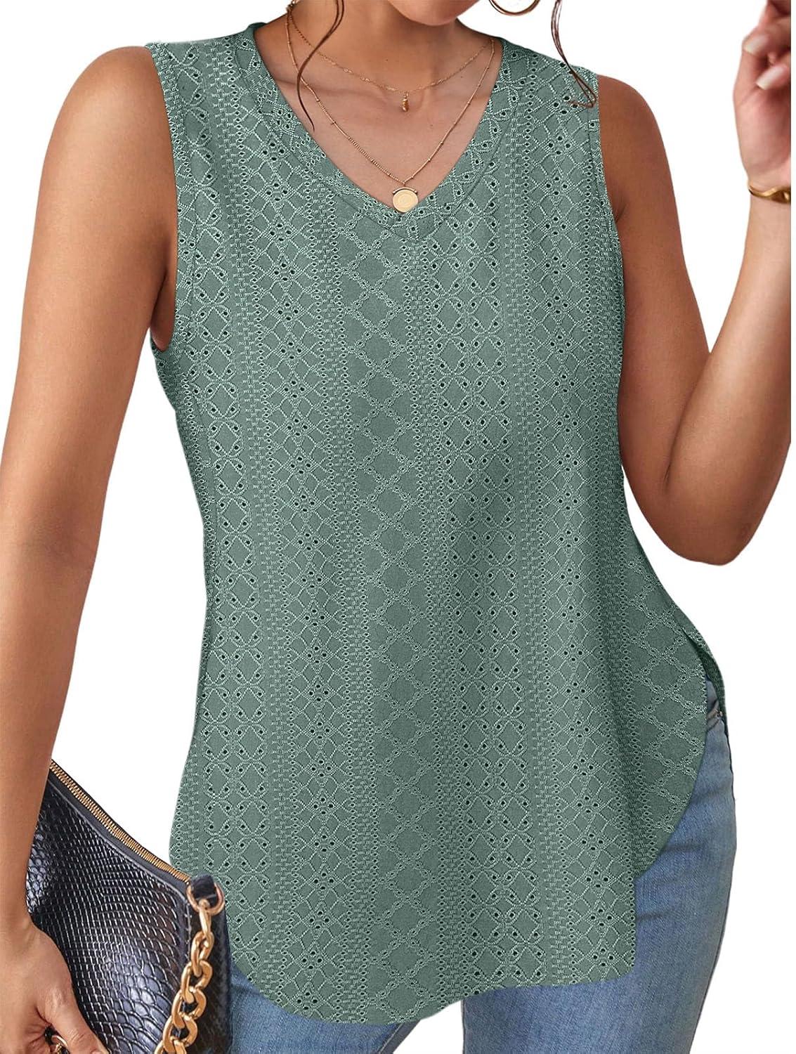 XIEERDUO Womens Tank Tops V Neck Eyelet Embroidery Casaul Sleeveless Shirts(05-green)