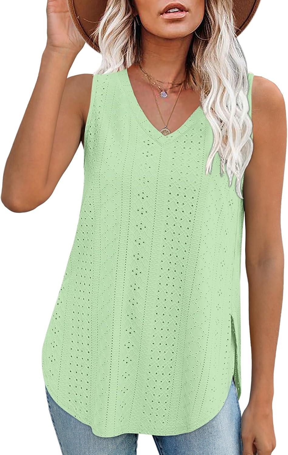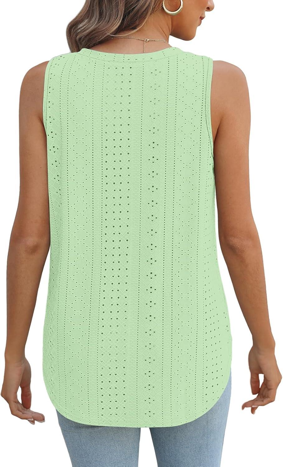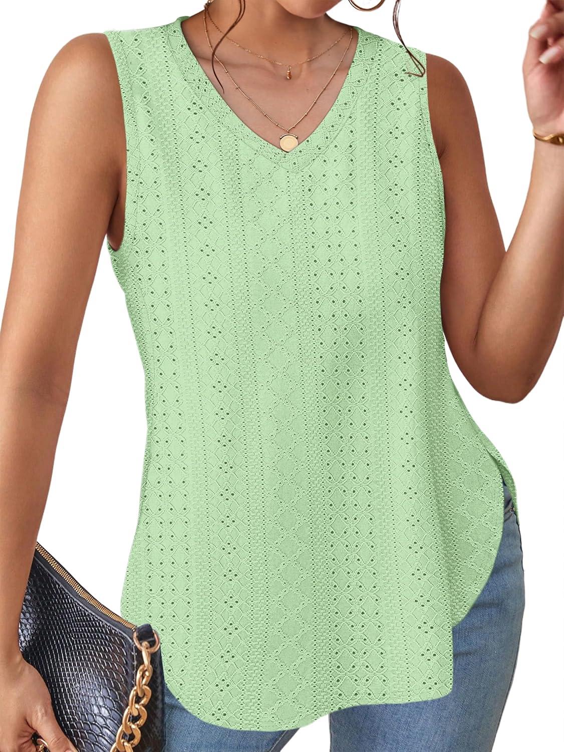 XIEERDUO Womens Tank Tops V Neck Eyelet Embroidery Casaul Sleeveless Shirts(06-lake Green)