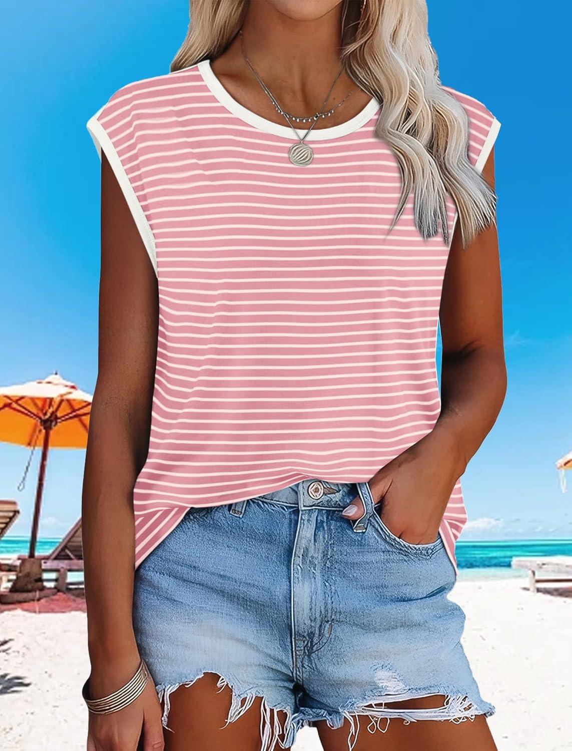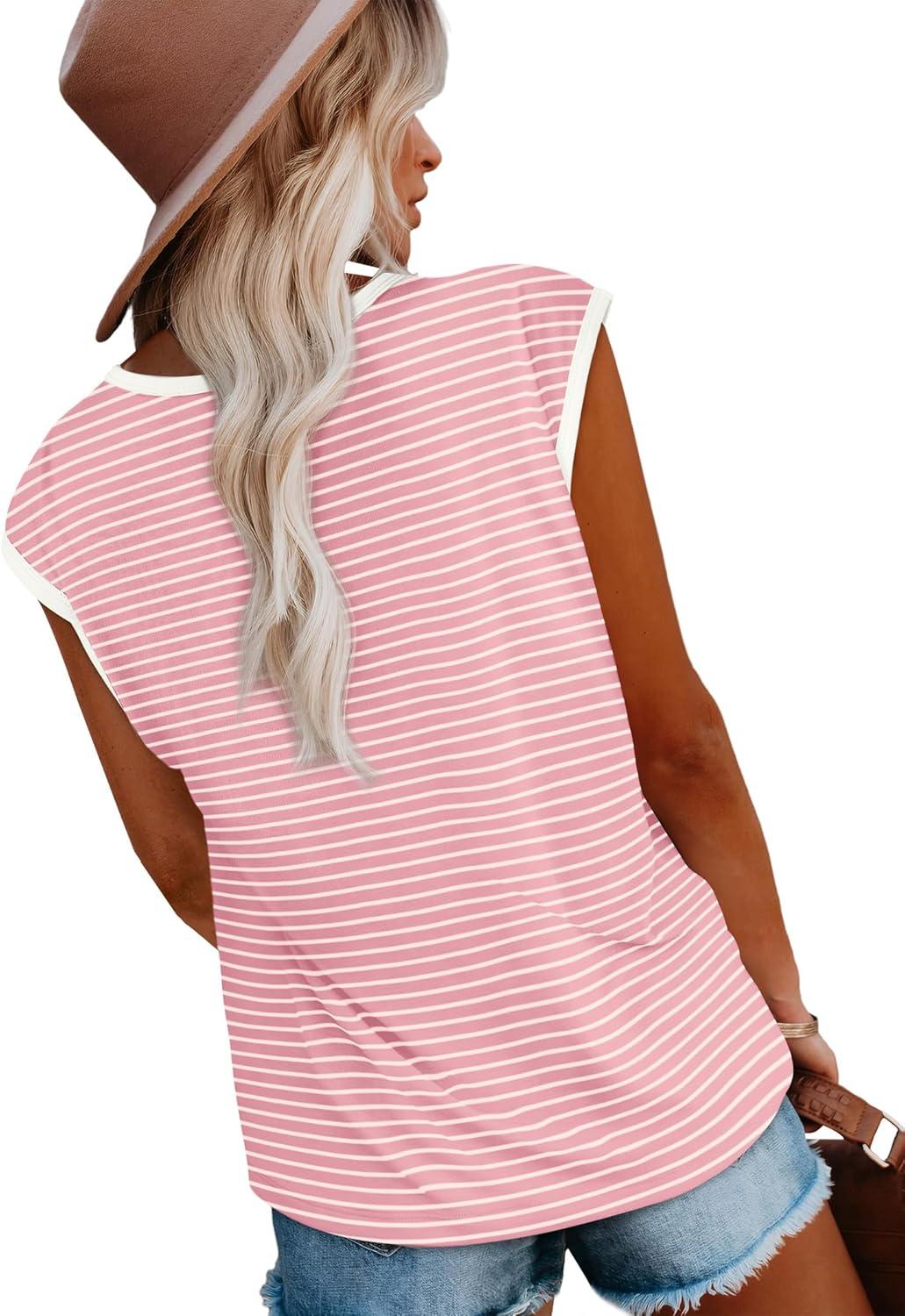 XIEERDUO Womens Tops Dressy Casual Summer Striped Shirts Cap Sleeve Tops Color Block Loose Fit(Pinkwhite White)