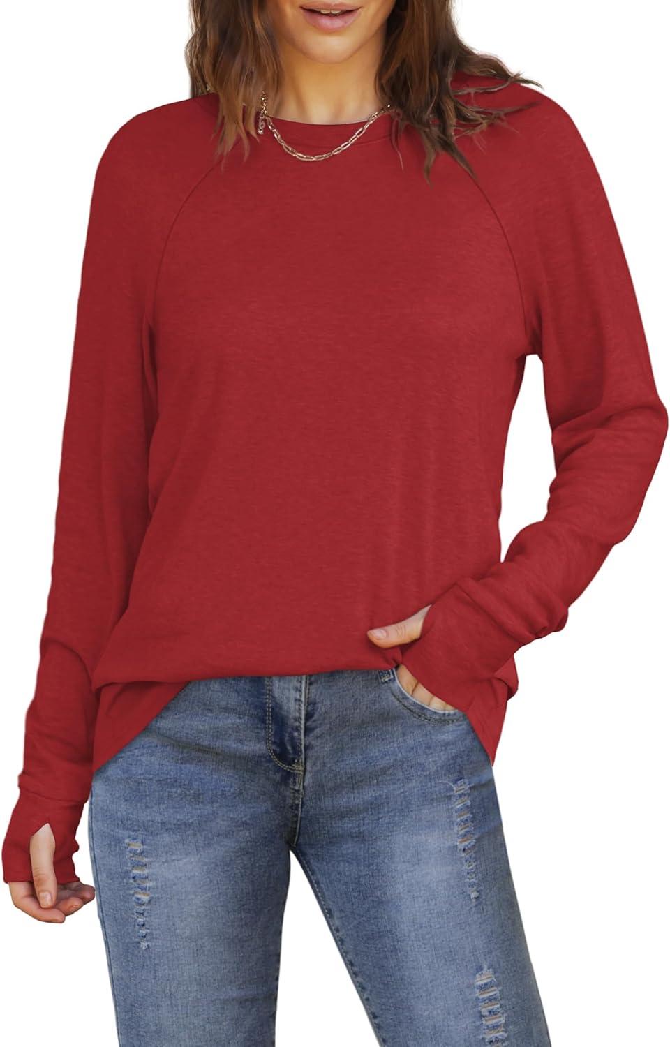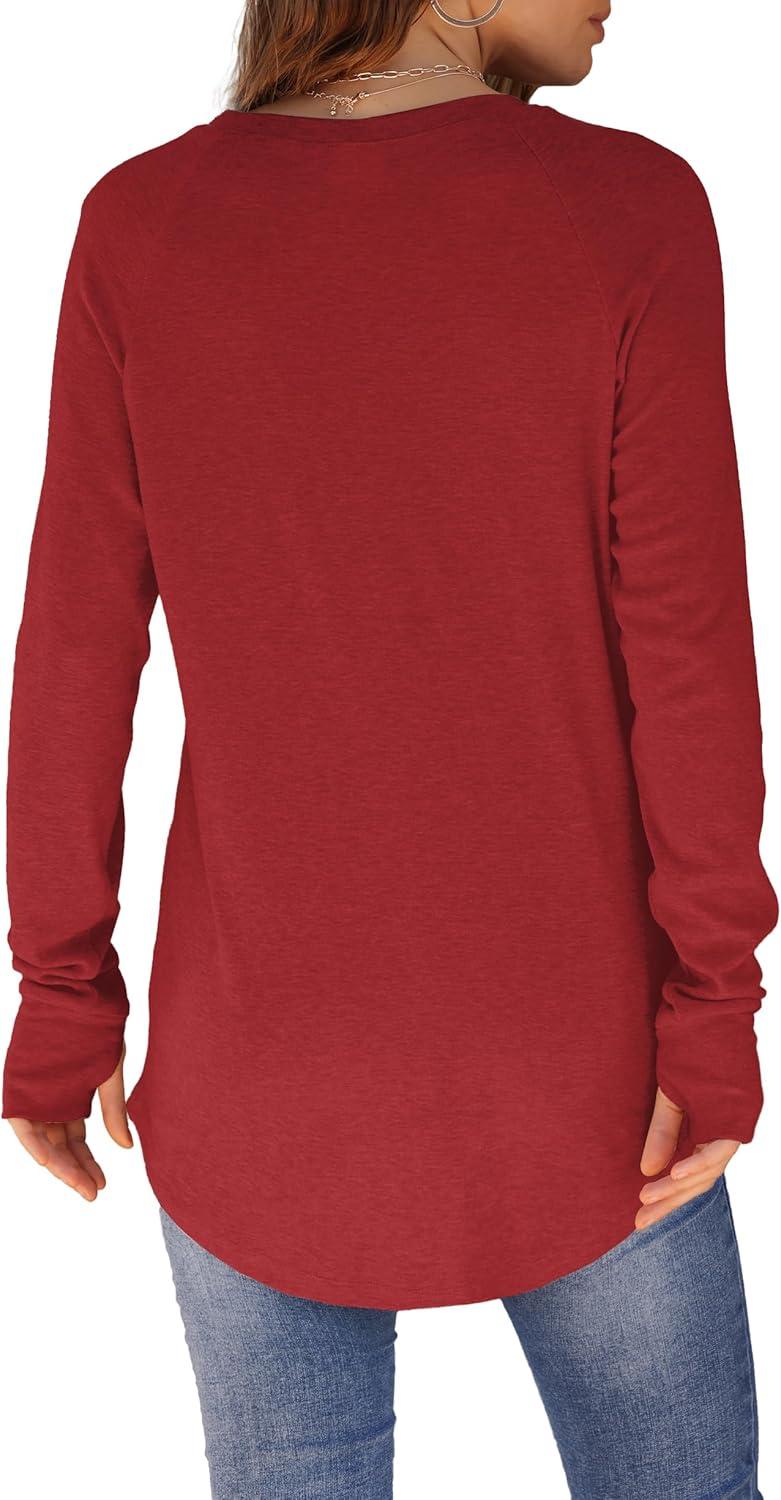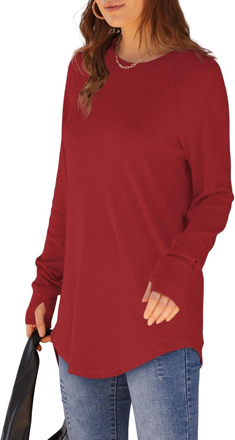 XIEERDUO Womens Tunic Tops to Wear with Leggings Long Sleeve Thumb Hole Shirts Crew Neck Curved Hem(L-red)